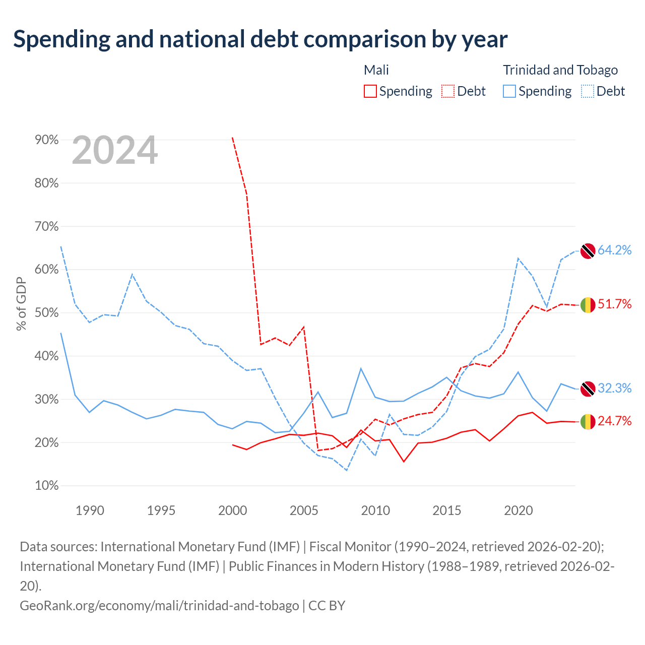 Mali has $13.9B in government debt (51.7% of GDP), compared to $16.5B (64.2% of GDP) in Trinidad and Tobago.