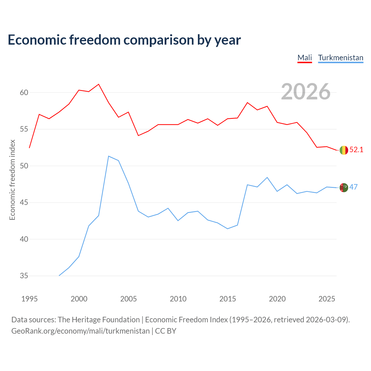 The Economic Freedom Index for Mali is 52.1, ranking 150/197, compared to 47 for Turkmenistan, ranking 177/197. The chart above displays a comparison of annual changes in economic freedom indexes.