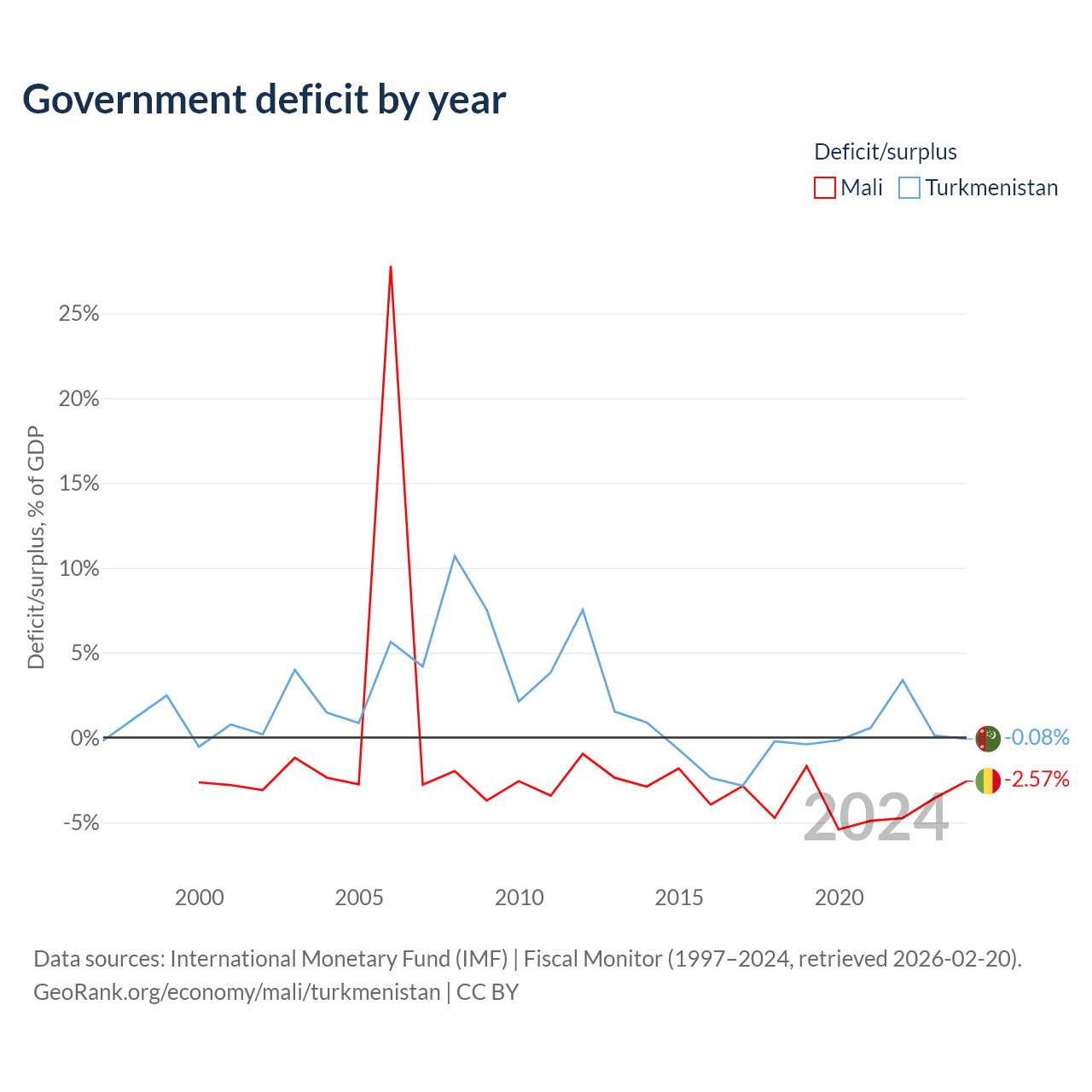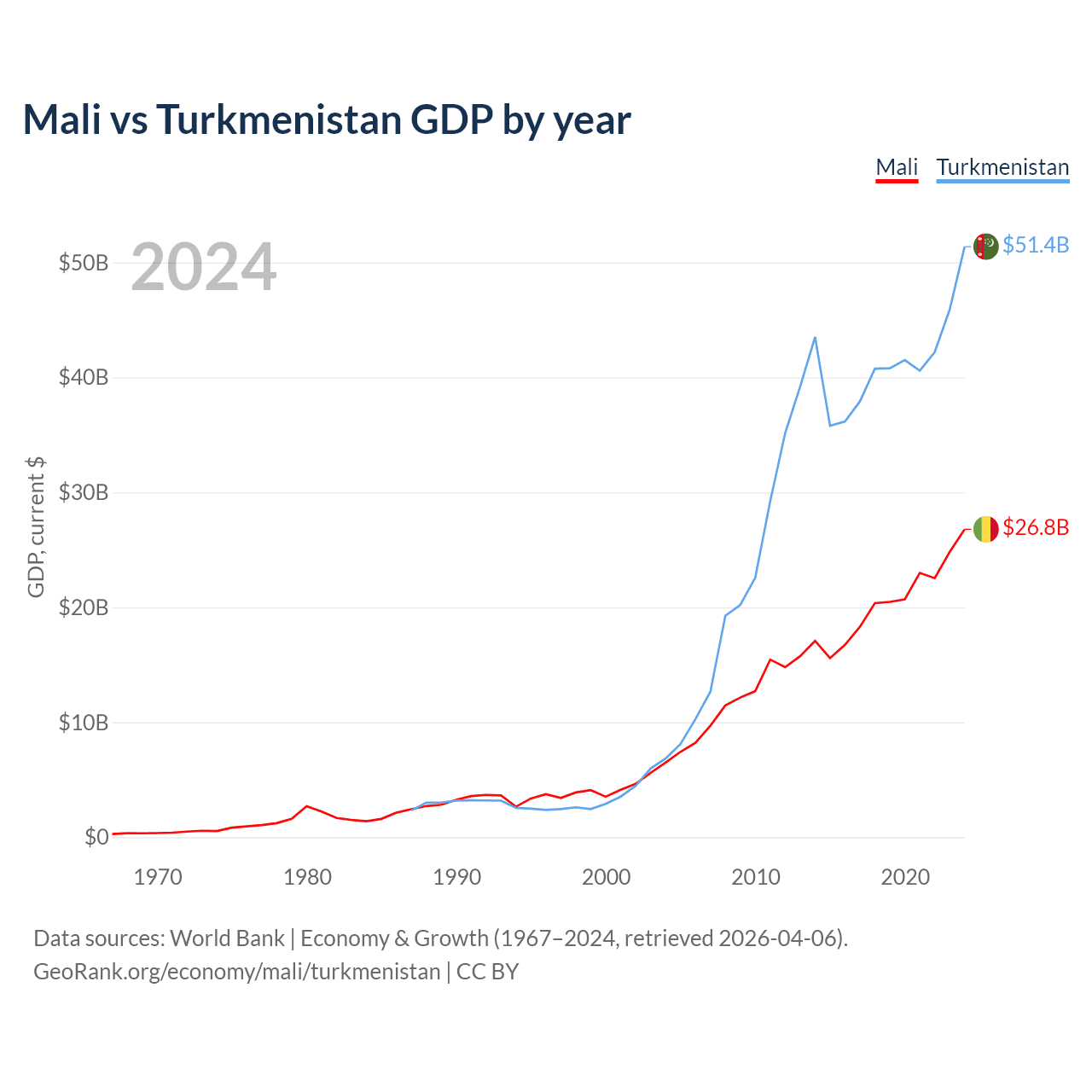 Mali has a GDP of $26.8B compared to $51.4B for Turkmenistan, ranking 113/197 and 92/197 by economy size, respectively.