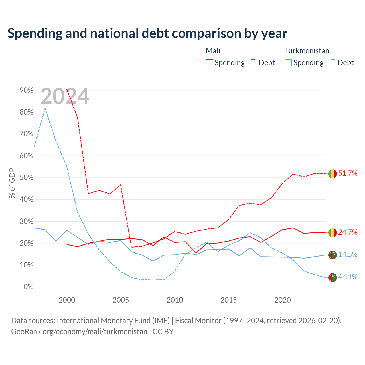 Mali has $13.9B in government debt (51.7% of GDP), compared to $2.11B (4.11% of GDP) in Turkmenistan.