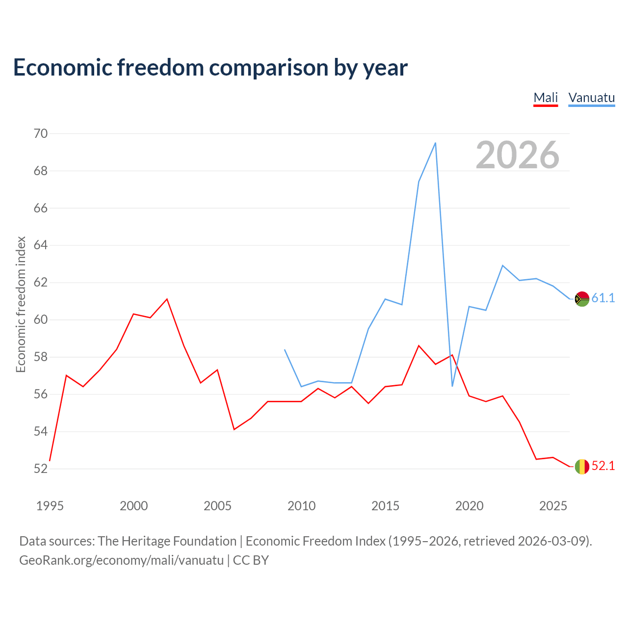 The Economic Freedom Index for Mali is 52.1, ranking 150/197, compared to 61.1 for Vanuatu, ranking 92/197. The chart above displays a comparison of annual changes in economic freedom indexes.