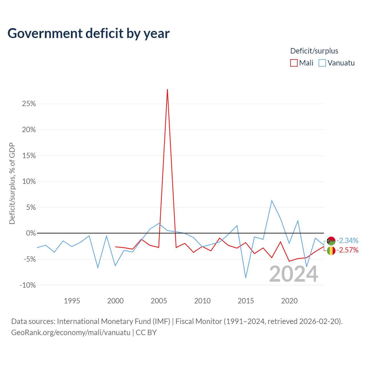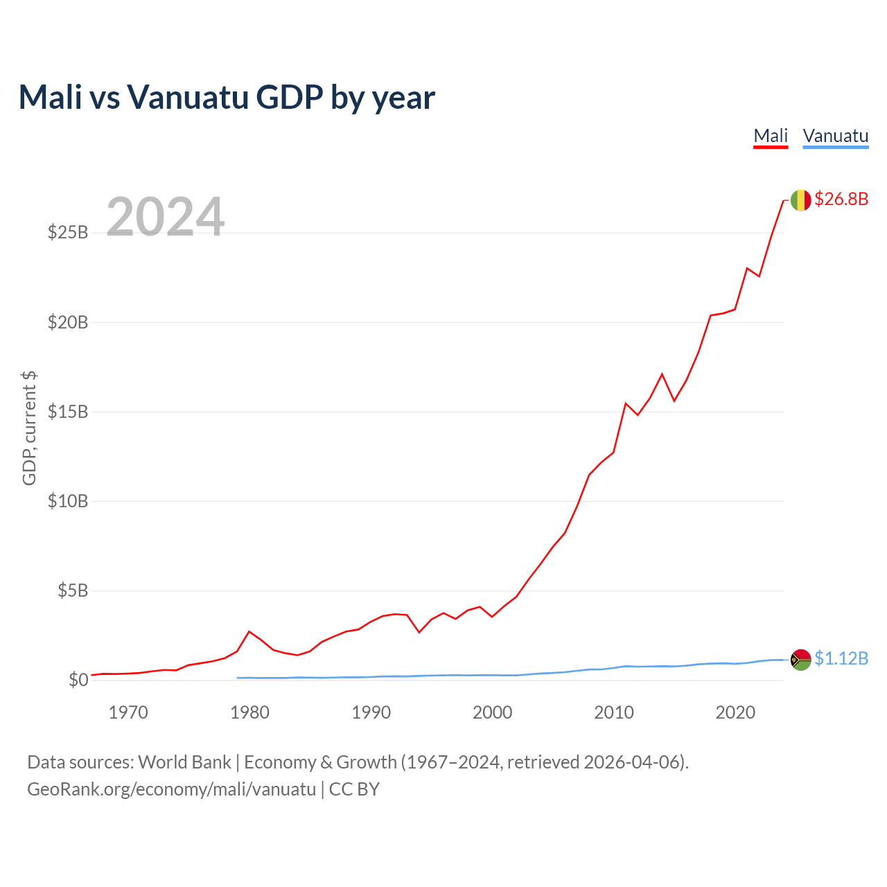 Mali has a GDP of $26.8B compared to $1.12B for Vanuatu, ranking 113/197 and 188/197 by economy size, respectively.