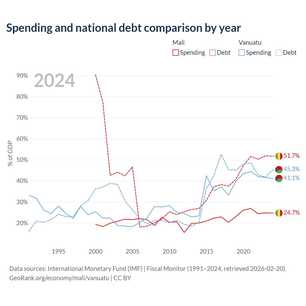 Mali has $13.9B in government debt (51.7% of GDP), compared to $507M (45.3% of GDP) in Vanuatu.