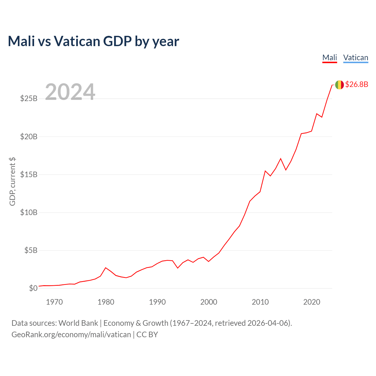 Mali has a GDP of $26.8B compared to $19.8M for the Vatican, ranking 113/197 and 197/197 by economy size, respectively.