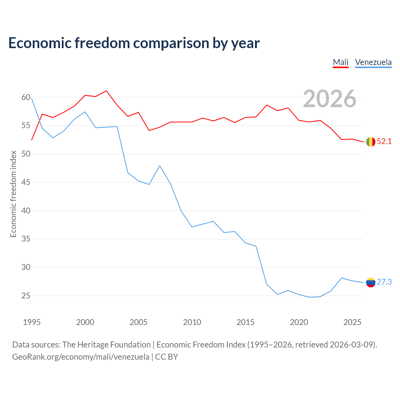 The Economic Freedom Index for Mali is 52.1, ranking 150/197, compared to 27.3 for Venezuela, ranking 194/197. The chart above displays a comparison of annual changes in economic freedom indexes.