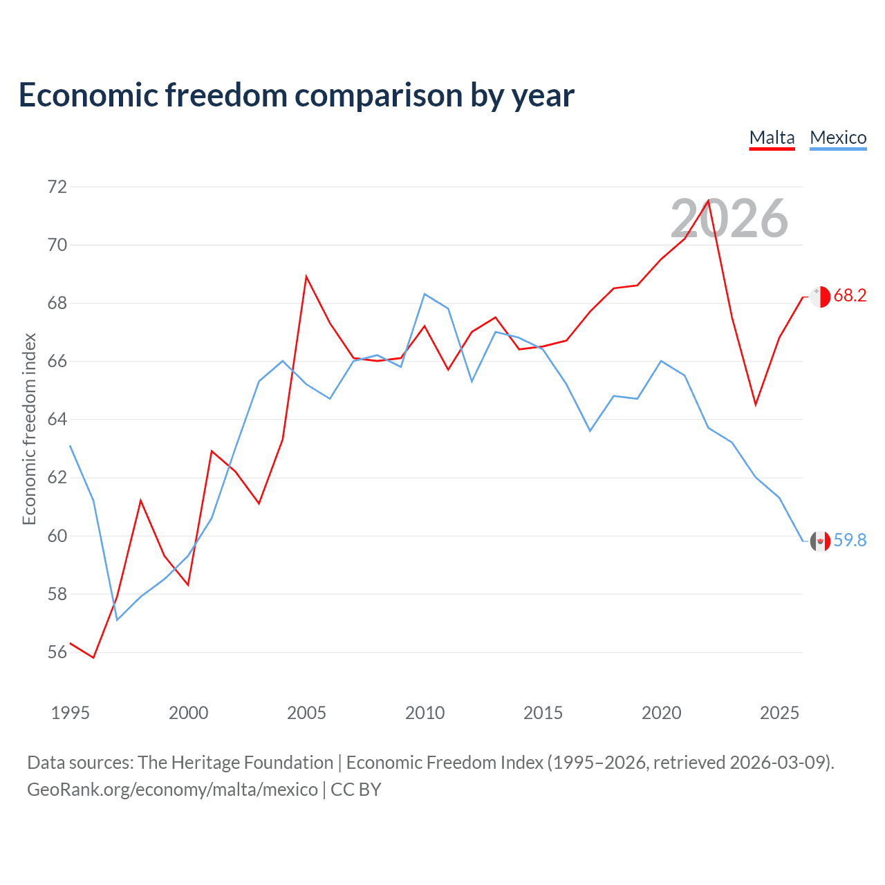 The Economic Freedom Index for Malta is 68.2, ranking 49/197, compared to 59.8 for Mexico, ranking 102/197. The chart above displays a comparison of annual changes in economic freedom indexes.