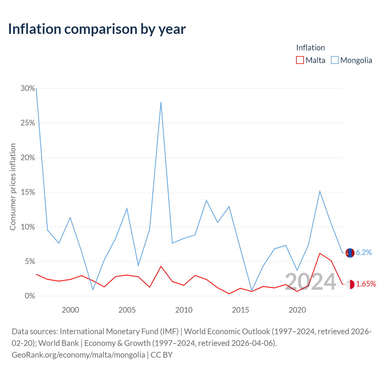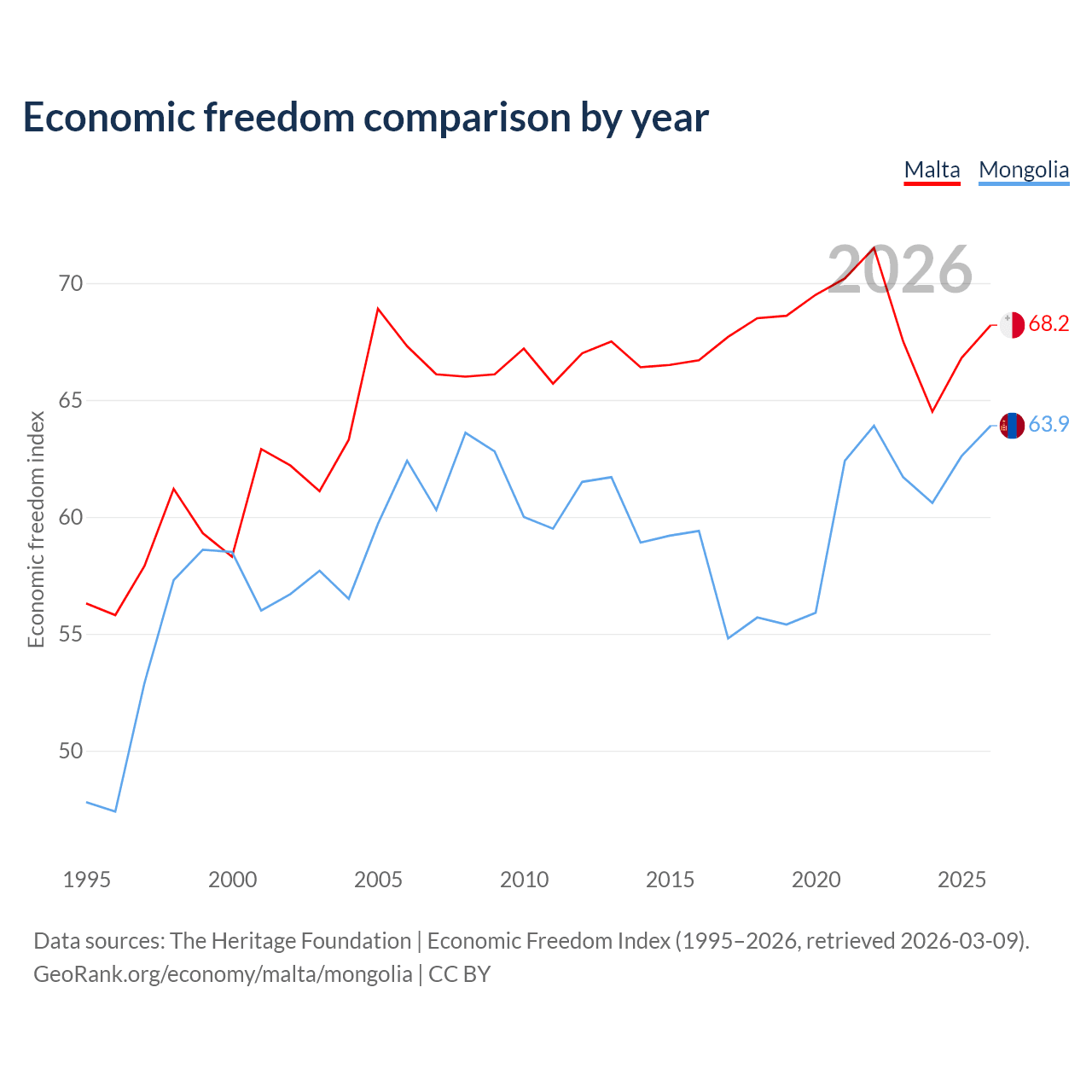 The Economic Freedom Index for Malta is 68.2, ranking 49/197, compared to 63.9 for Mongolia, ranking 76/197. The chart above displays a comparison of annual changes in economic freedom indexes.