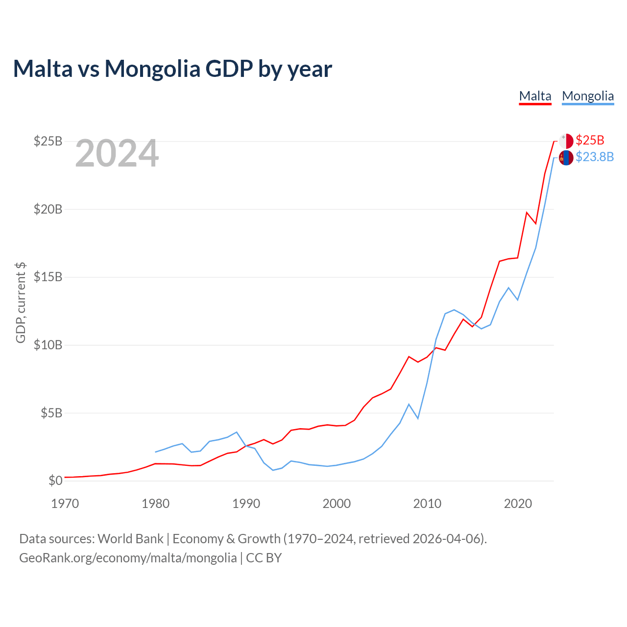 Malta has a GDP of $25B compared to $23.8B for Mongolia, ranking 119/197 and 121/197 by economy size, respectively.