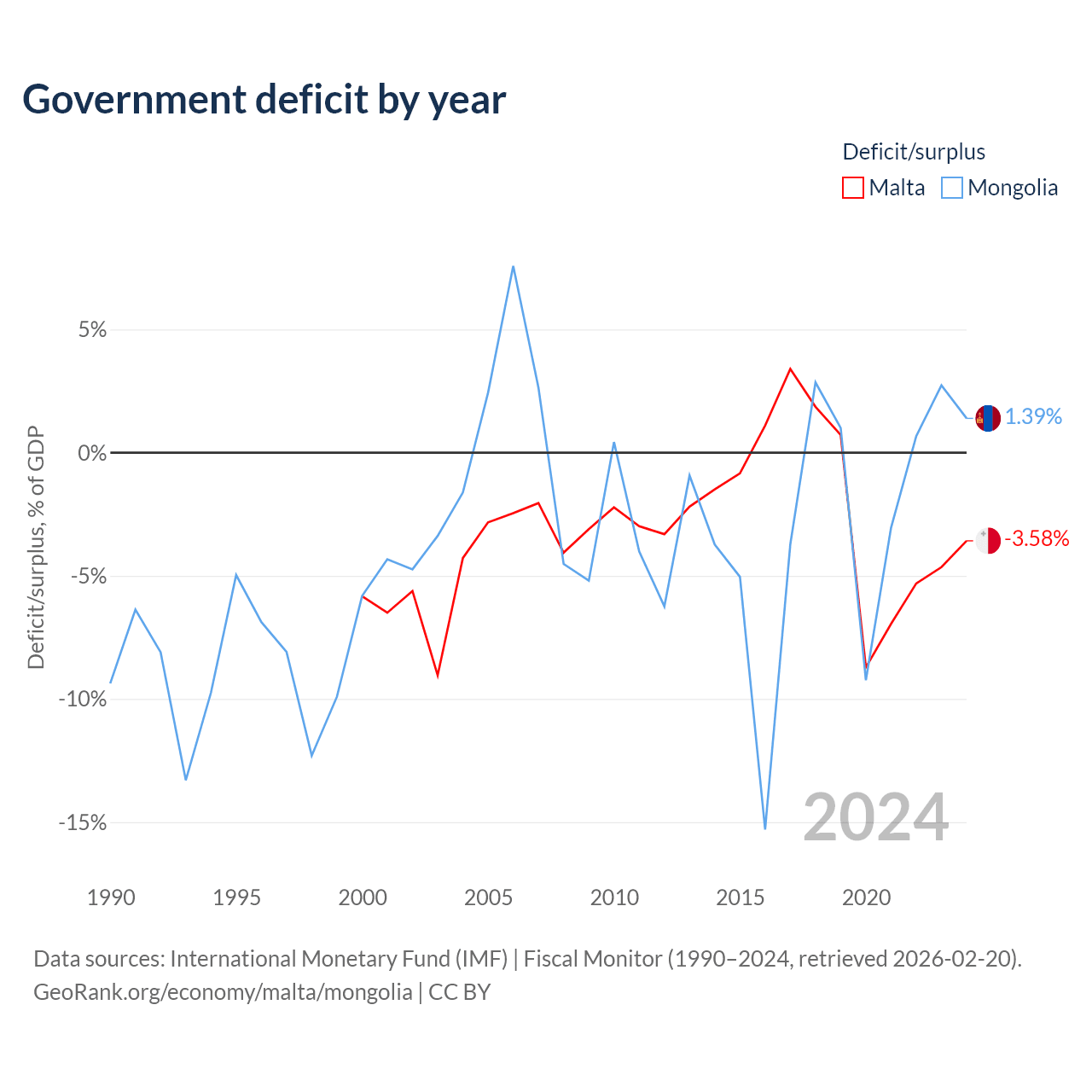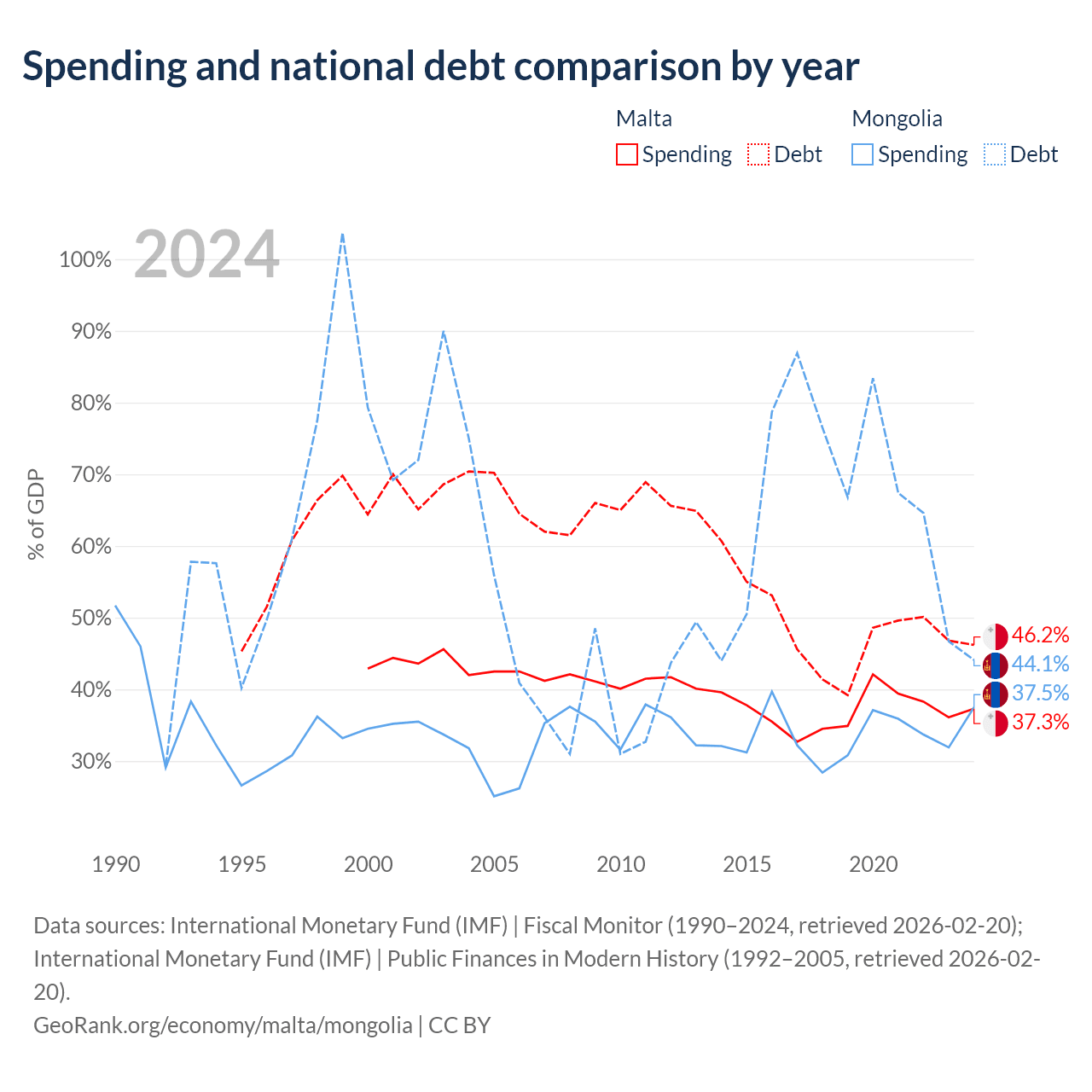 Malta has $11.5B in government debt (46.2% of GDP), compared to $10.5B (44.1% of GDP) in Mongolia.