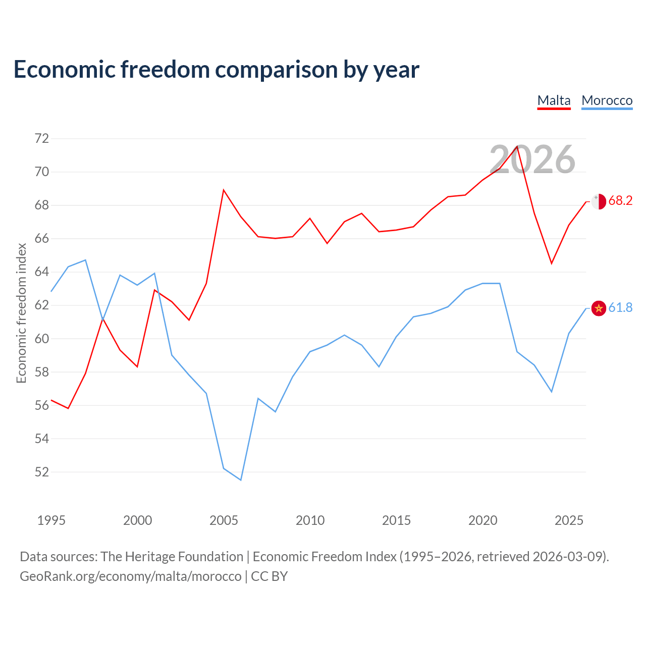 The Economic Freedom Index for Malta is 68.2, ranking 49/197, compared to 61.8 for Morocco, ranking 91/197. The chart above displays a comparison of annual changes in economic freedom indexes.