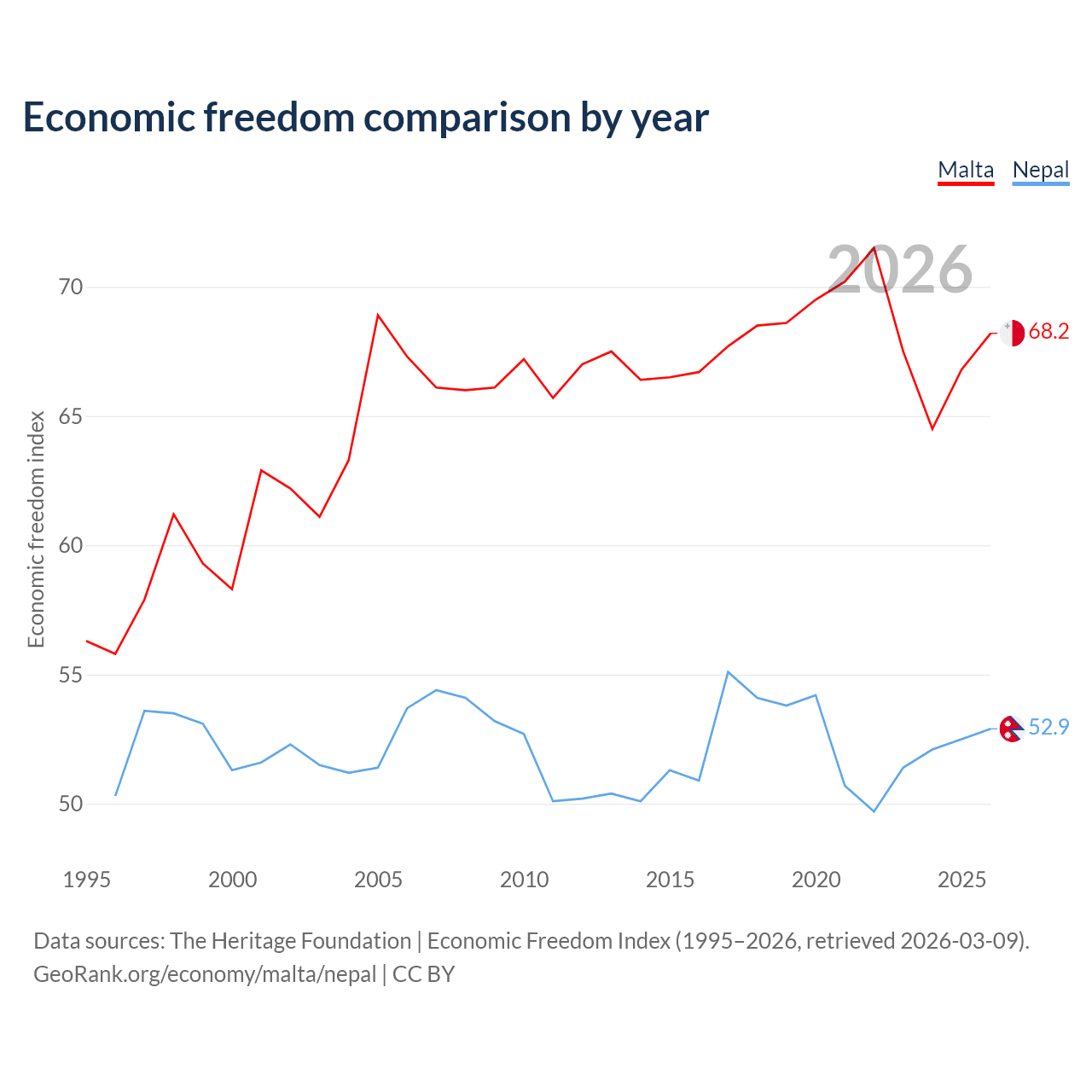 The Economic Freedom Index for Malta is 68.2, ranking 49/197, compared to 52.9 for Nepal, ranking 144/197. The chart above displays a comparison of annual changes in economic freedom indexes.