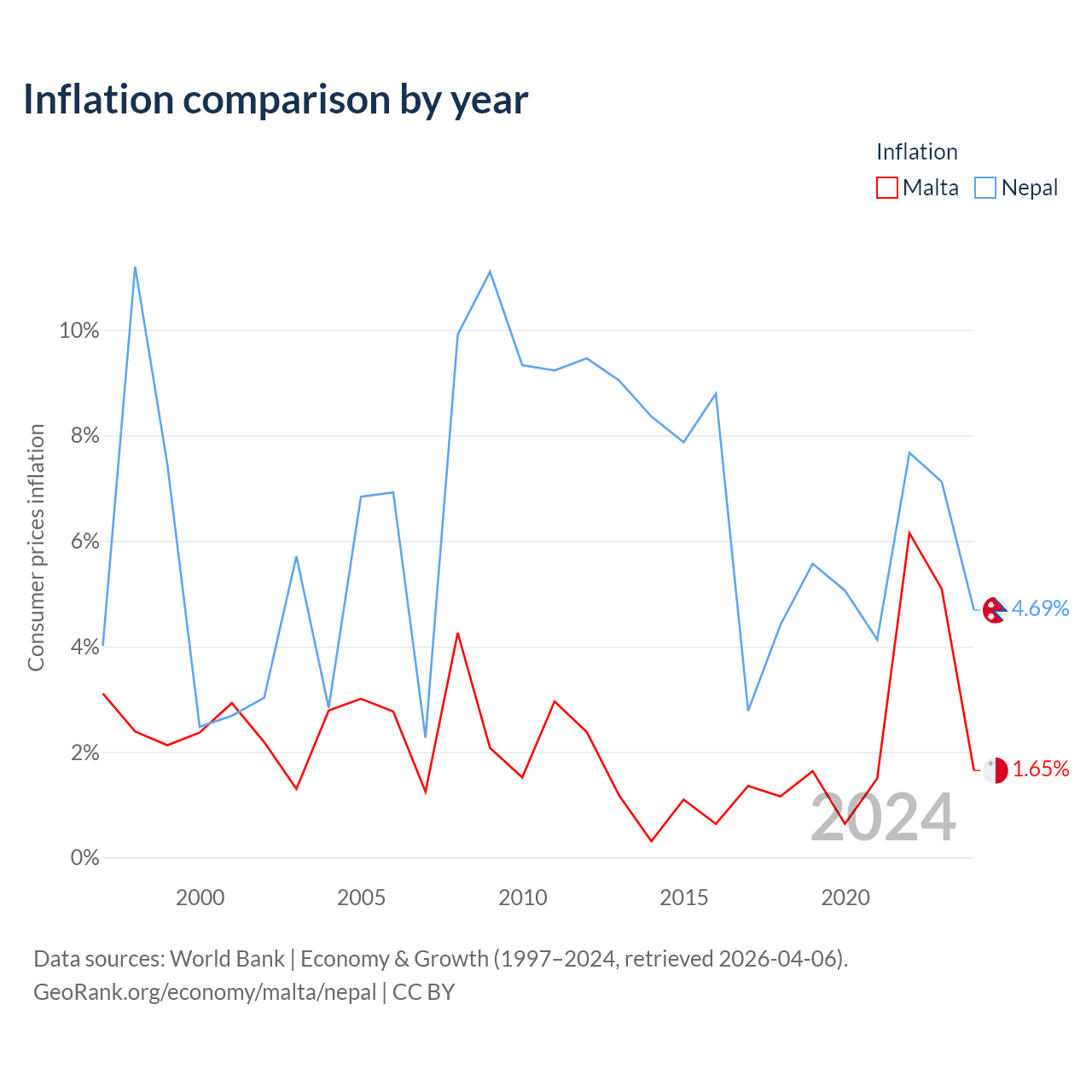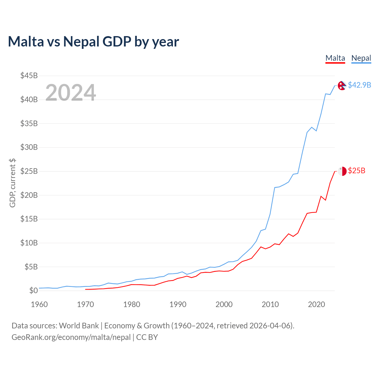 Malta has a GDP of $25B compared to $42.9B for Nepal, ranking 119/197 and 101/197 by economy size, respectively.