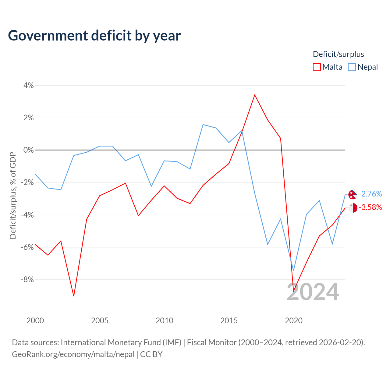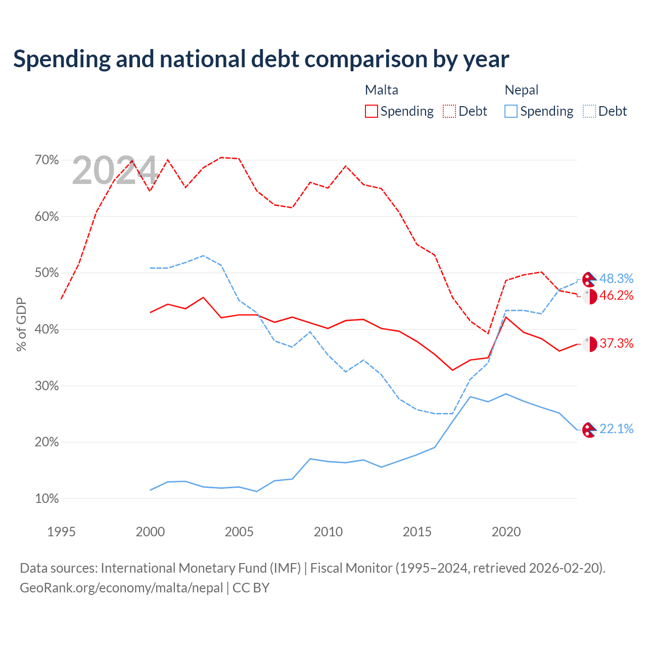 Malta has $11.5B in government debt (46.2% of GDP), compared to $20.7B (48.3% of GDP) in Nepal.