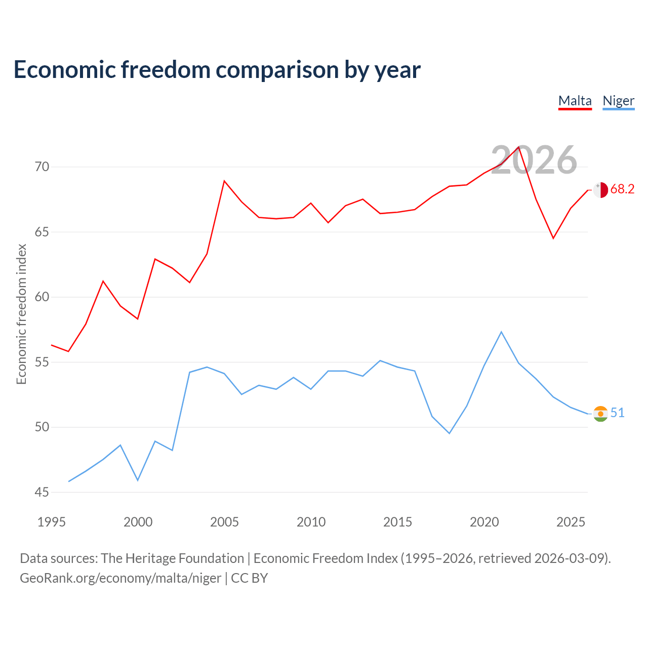 The Economic Freedom Index for Malta is 68.2, ranking 49/197, compared to 51 for Niger, ranking 156/197. The chart above displays a comparison of annual changes in economic freedom indexes.