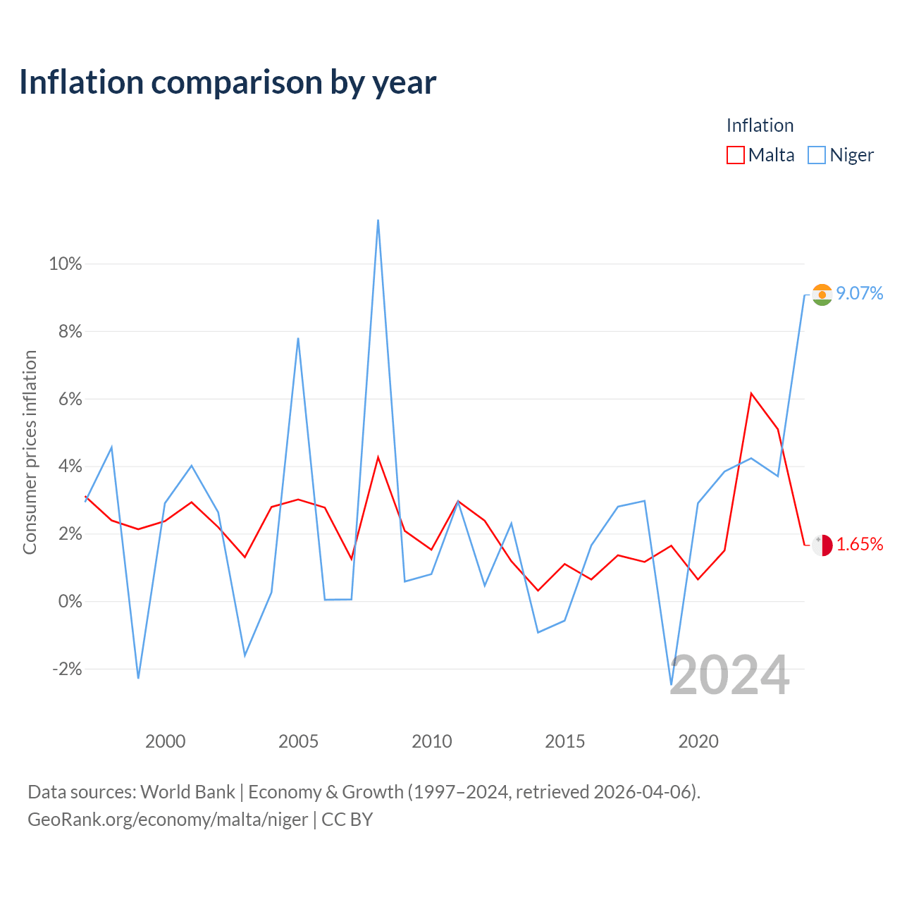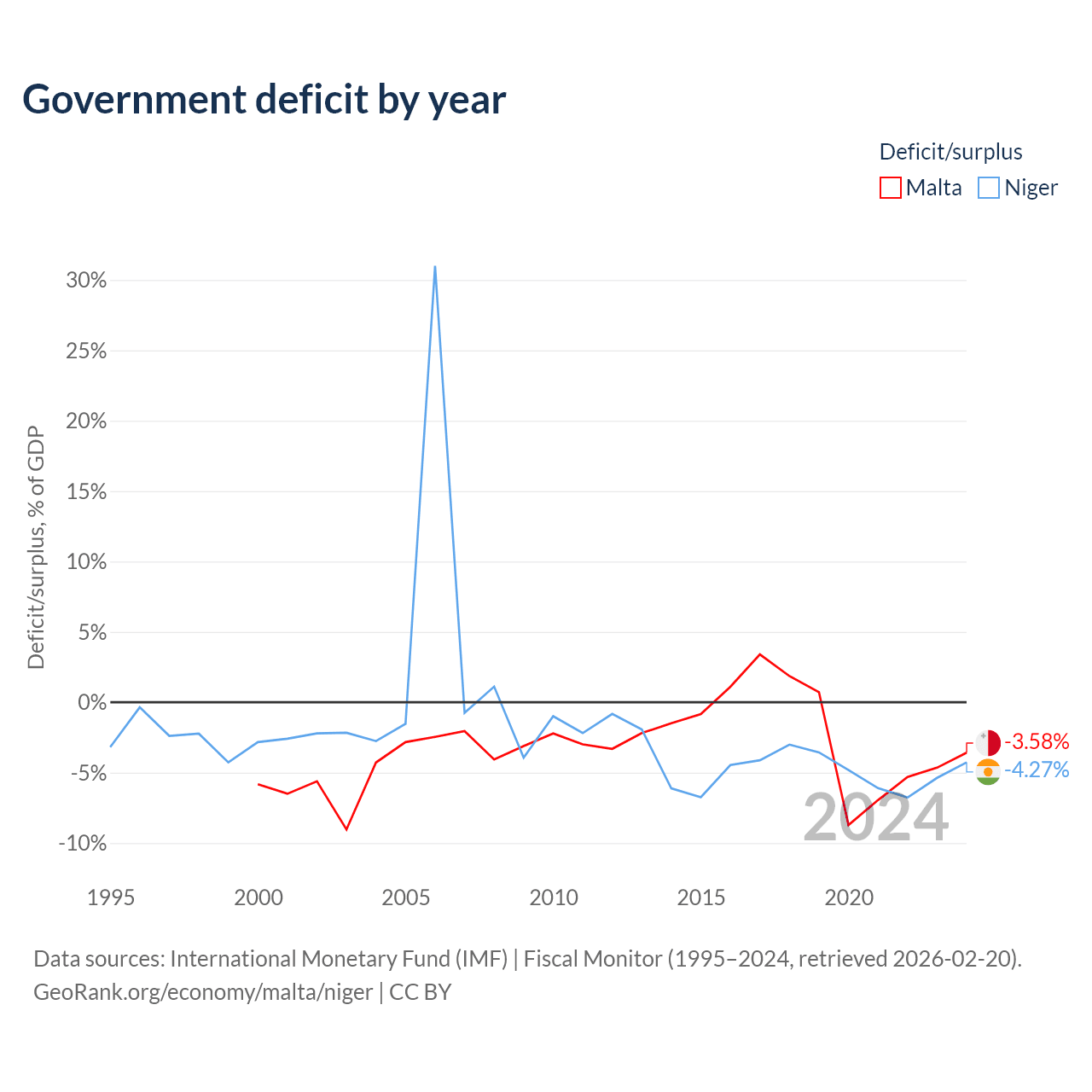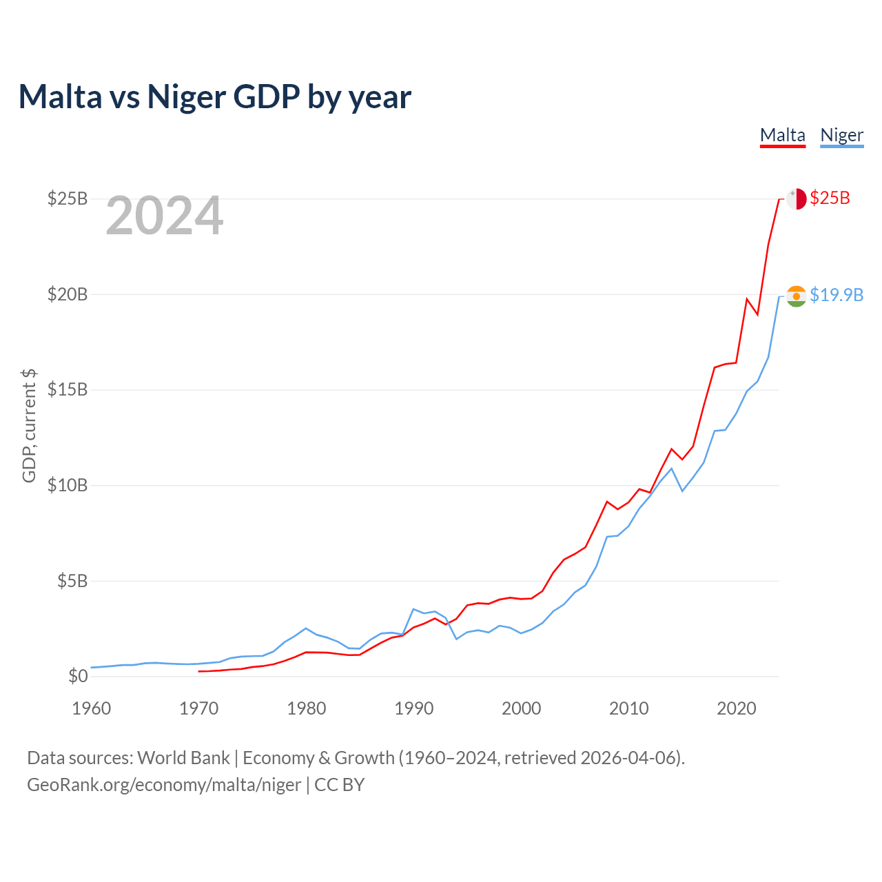 Malta has a GDP of $25B compared to $19.9B for Niger, ranking 119/197 and 130/197 by economy size, respectively.