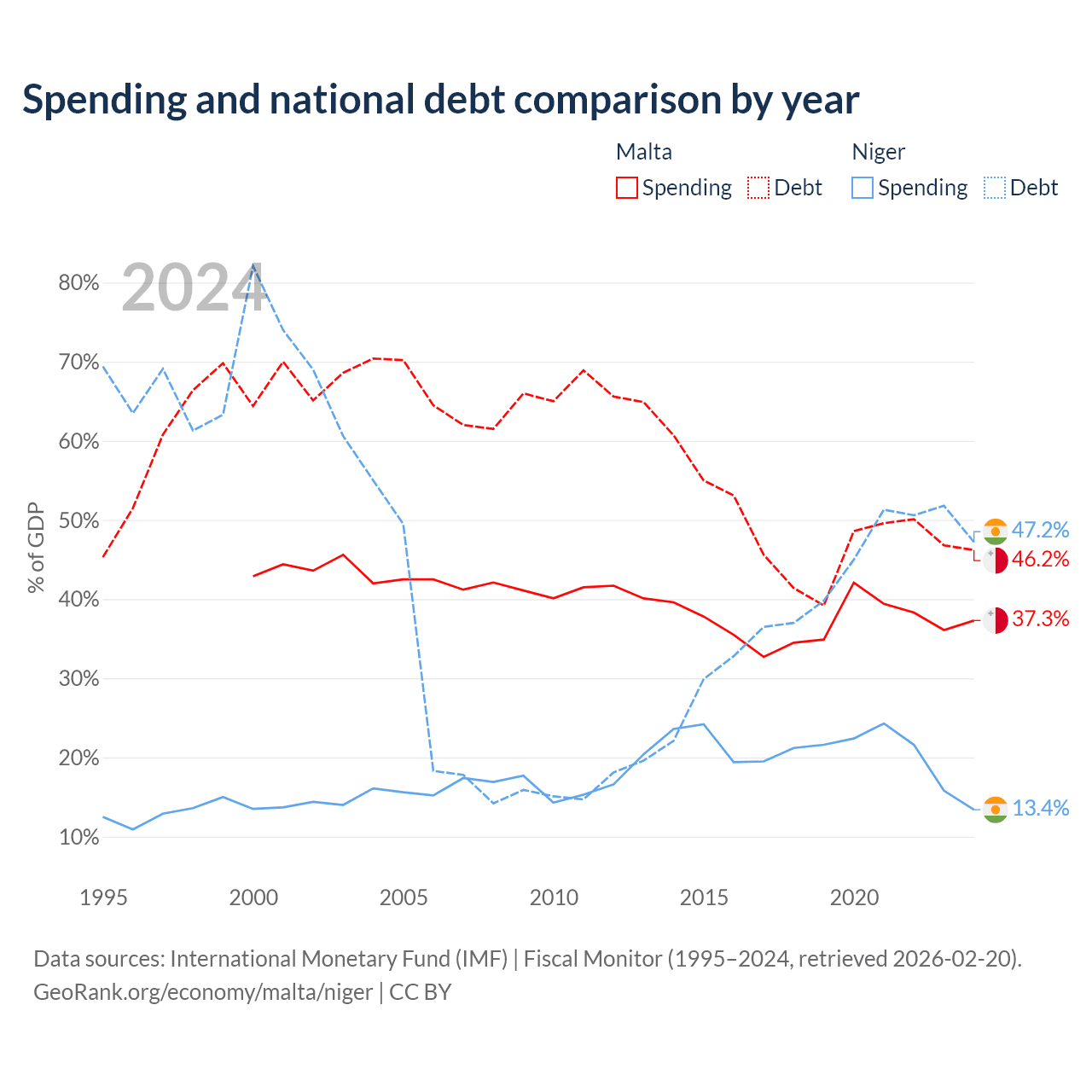 Malta has $11.5B in government debt (46.2% of GDP), compared to $9.39B (47.2% of GDP) in Niger.
