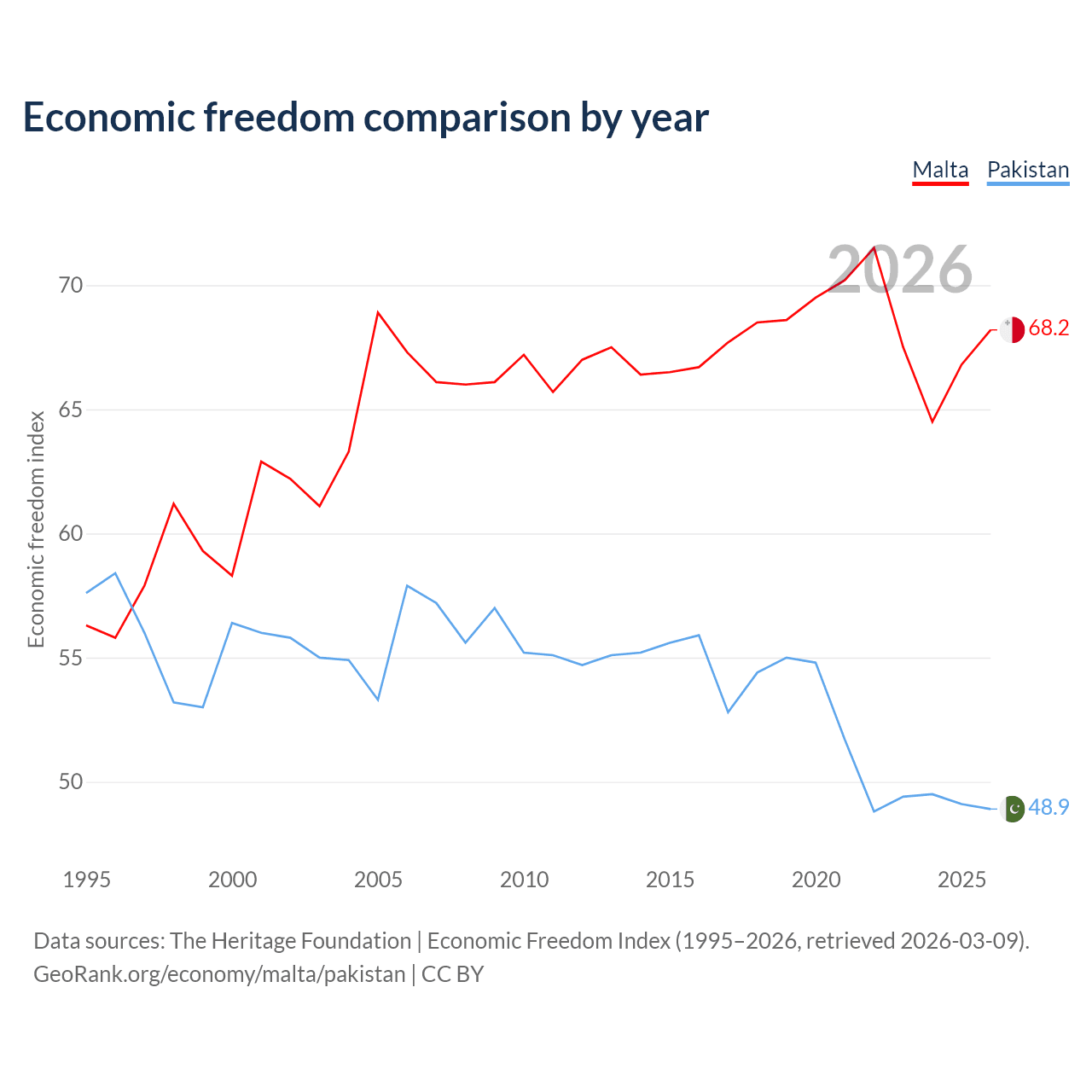 The Economic Freedom Index for Malta is 68.2, ranking 49/197, compared to 48.9 for Pakistan, ranking 168/197. The chart above displays a comparison of annual changes in economic freedom indexes.
