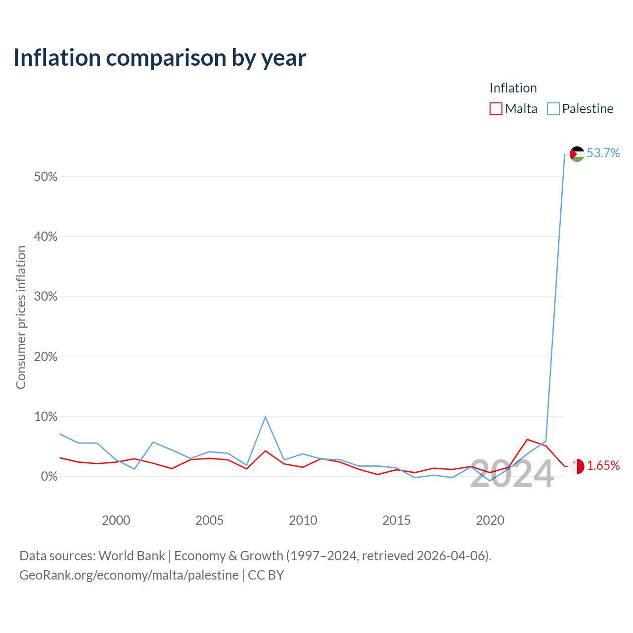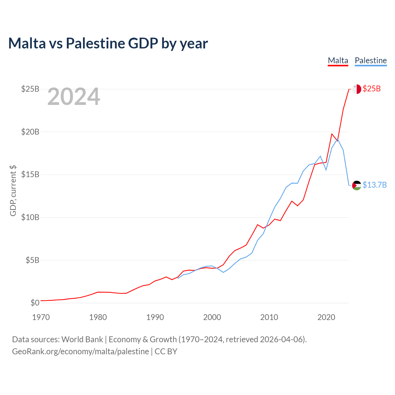 Malta has a GDP of $25B compared to $13.7B for Palestine, ranking 119/197 and 146/197 by economy size, respectively.