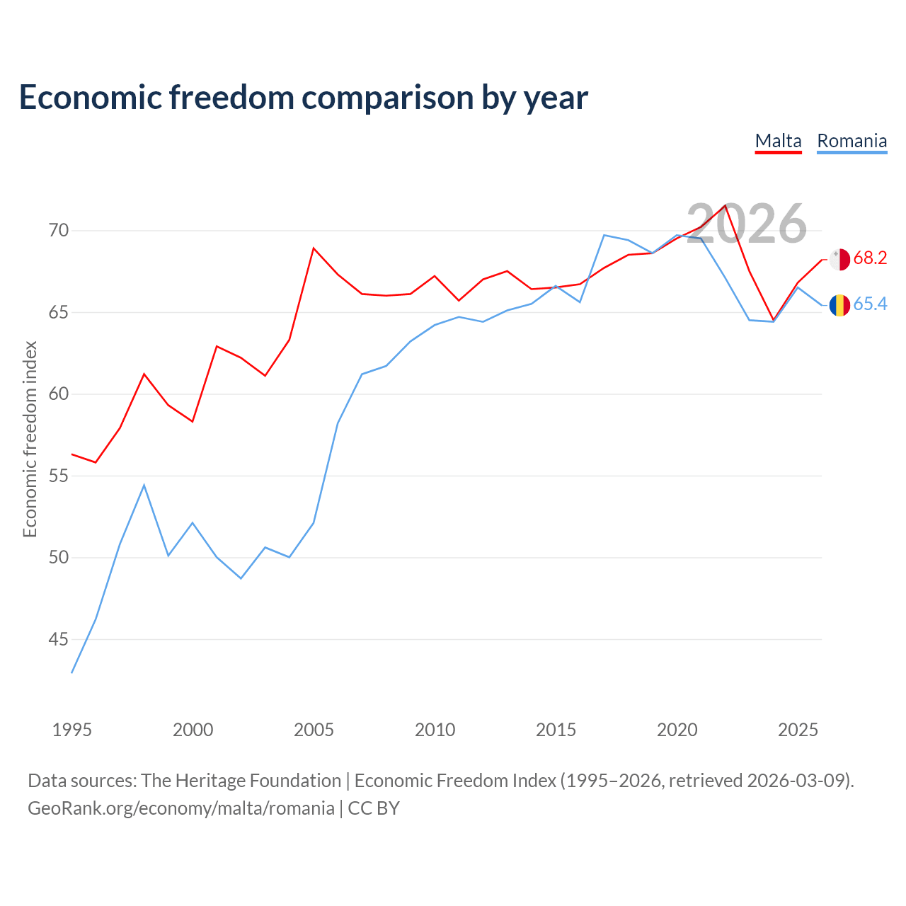 The Economic Freedom Index for Malta is 68.2, ranking 49/197, compared to 65.4 for Romania, ranking 64/197. The chart above displays a comparison of annual changes in economic freedom indexes.