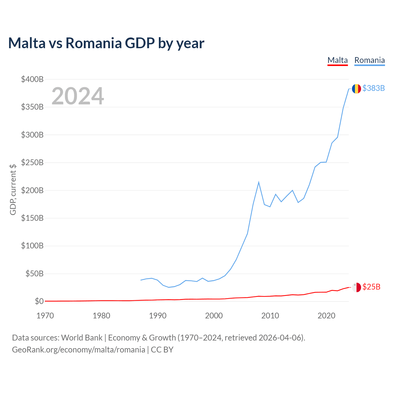Malta vs Romania GDP by year