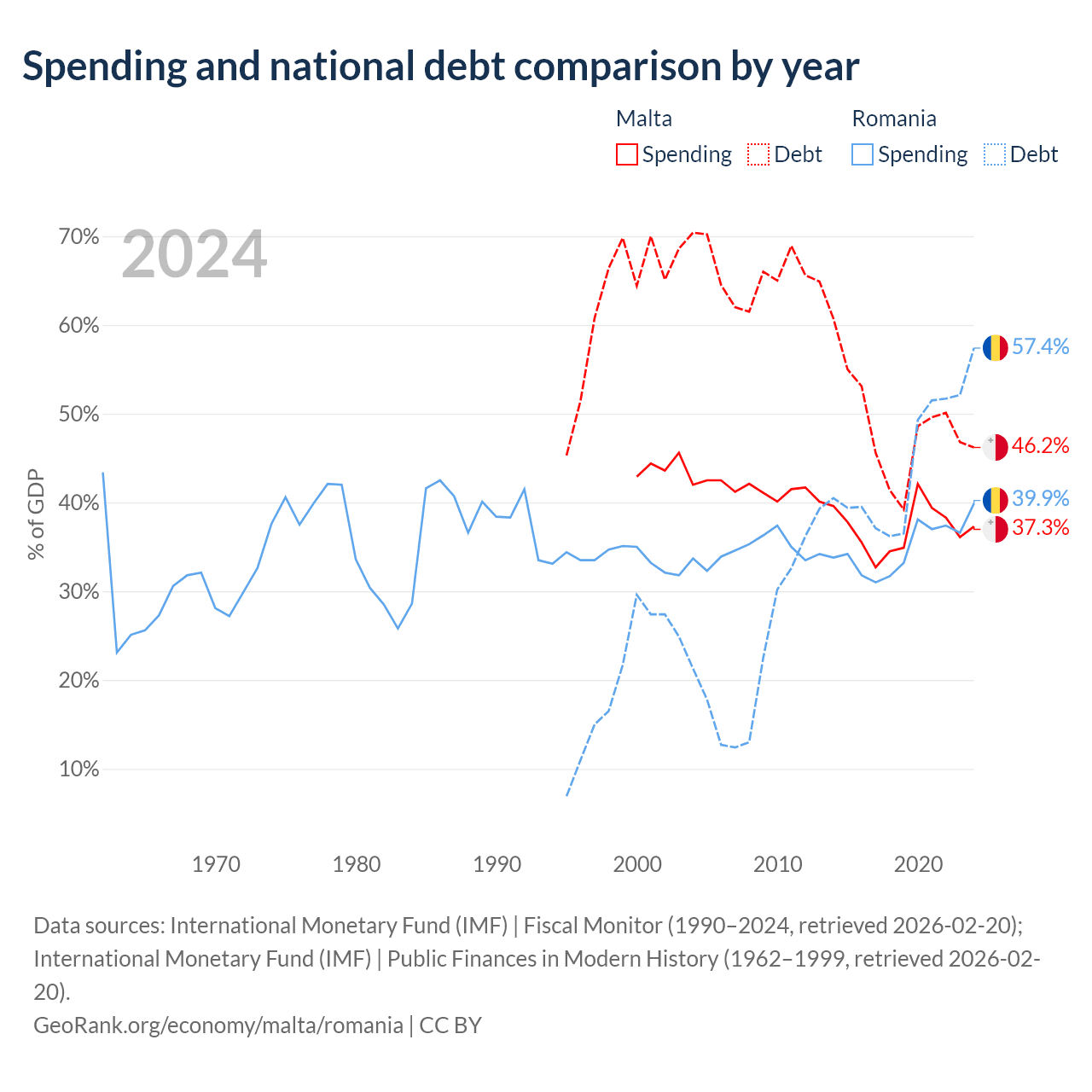Malta has $11.5B in government debt (46.2% of GDP), compared to $220B (57.4% of GDP) in Romania.