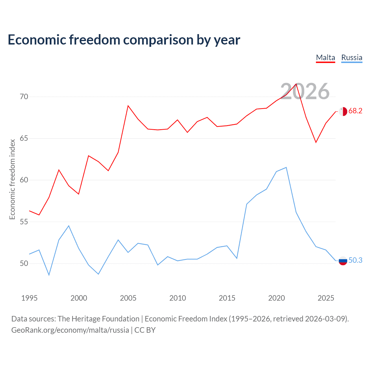 The Economic Freedom Index for Malta is 68.2, ranking 49/197, compared to 50.3 for Russia, ranking 161/197. The chart above displays a comparison of annual changes in economic freedom indexes.