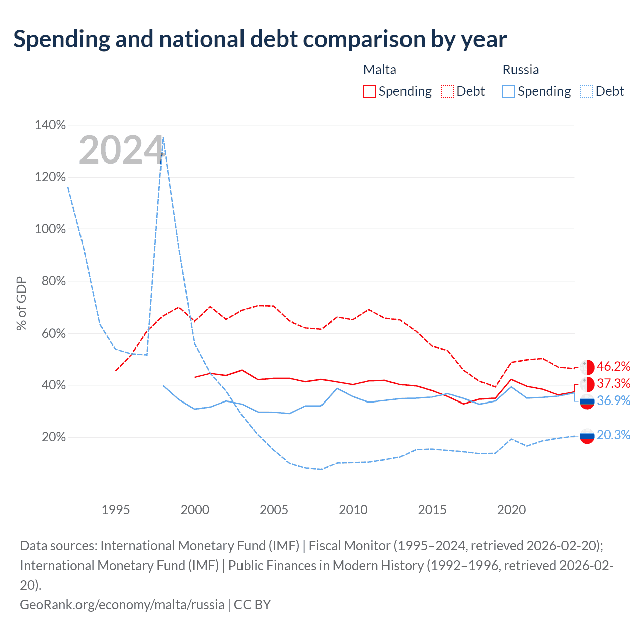 Malta has $11.5B in government debt (46.2% of GDP), compared to $440B (20.3% of GDP) in Russia.
