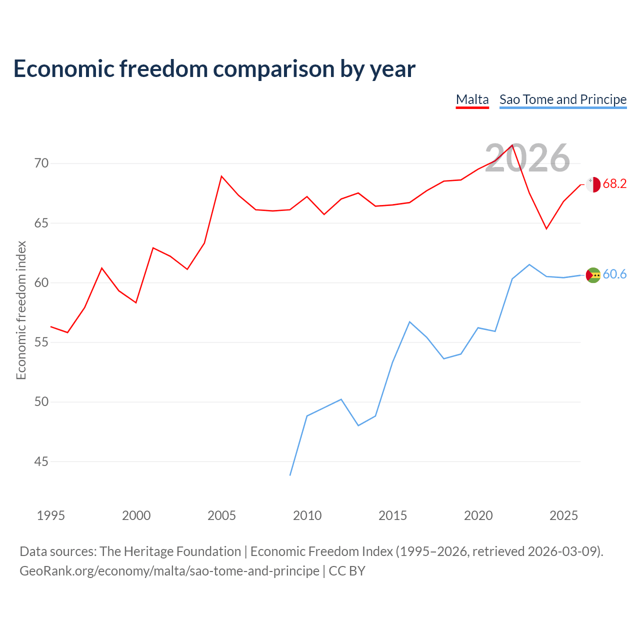 The Economic Freedom Index for Malta is 68.2, ranking 49/197, compared to 60.6 for Sao Tome and Principe, ranking 93/197. The chart above displays a comparison of annual changes in economic freedom indexes.