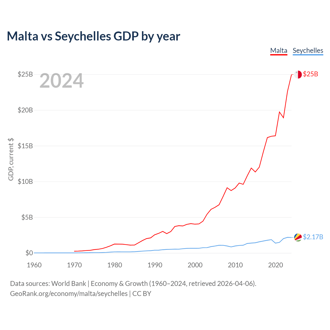 Malta has a GDP of $25B compared to $2.17B for the Seychelles, ranking 119/197 and 178/197 by economy size, respectively.