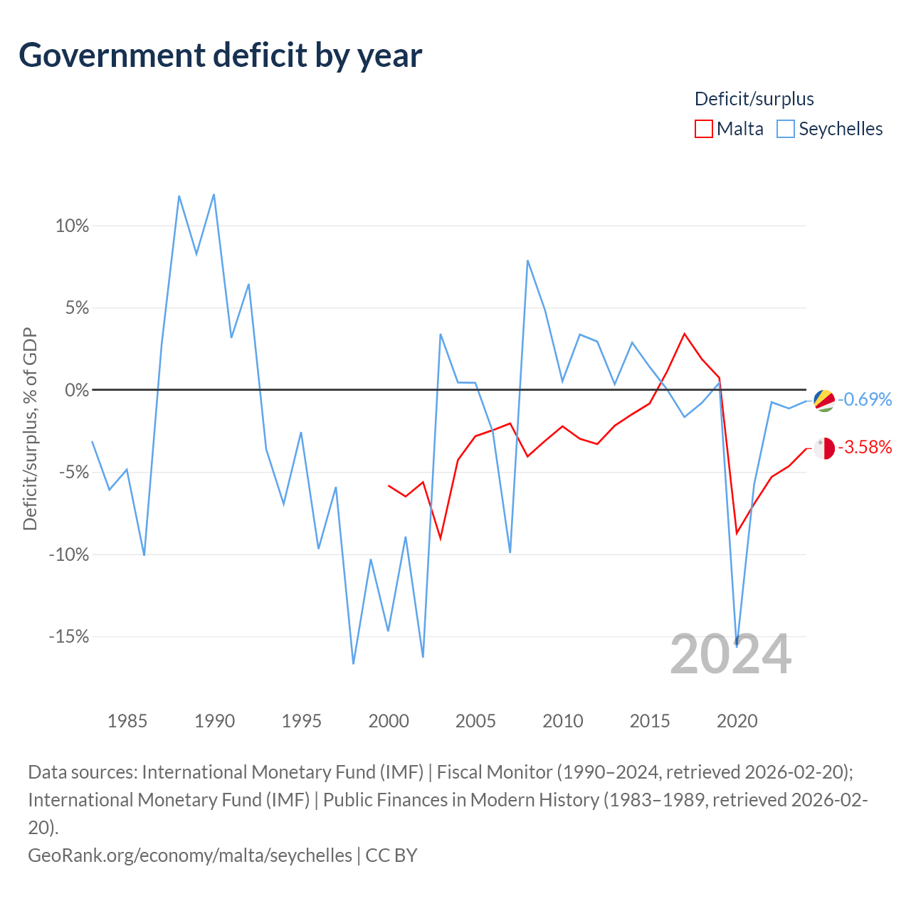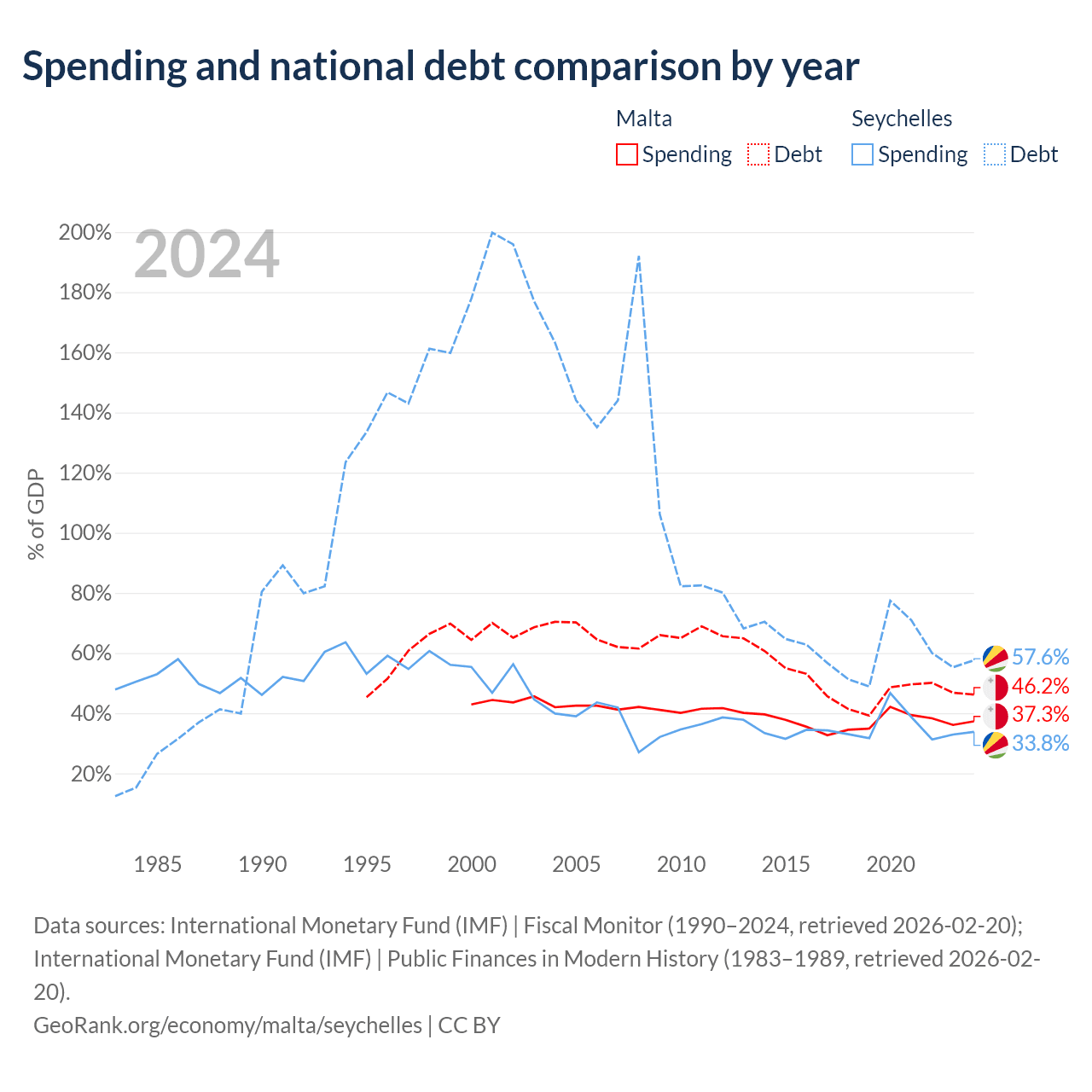 Malta has $11.5B in government debt (46.2% of GDP), compared to $1.25B (57.6% of GDP) in the Seychelles.