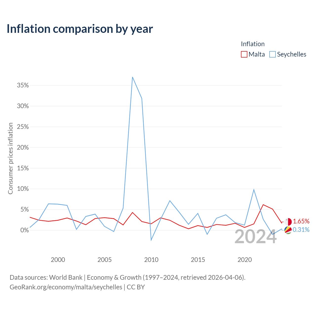 The Economic Freedom Index for Malta is 68.2, ranking 49/197, compared to 66.5 for the Seychelles, ranking 60/197. The chart above displays a comparison of annual changes in economic freedom indexes.