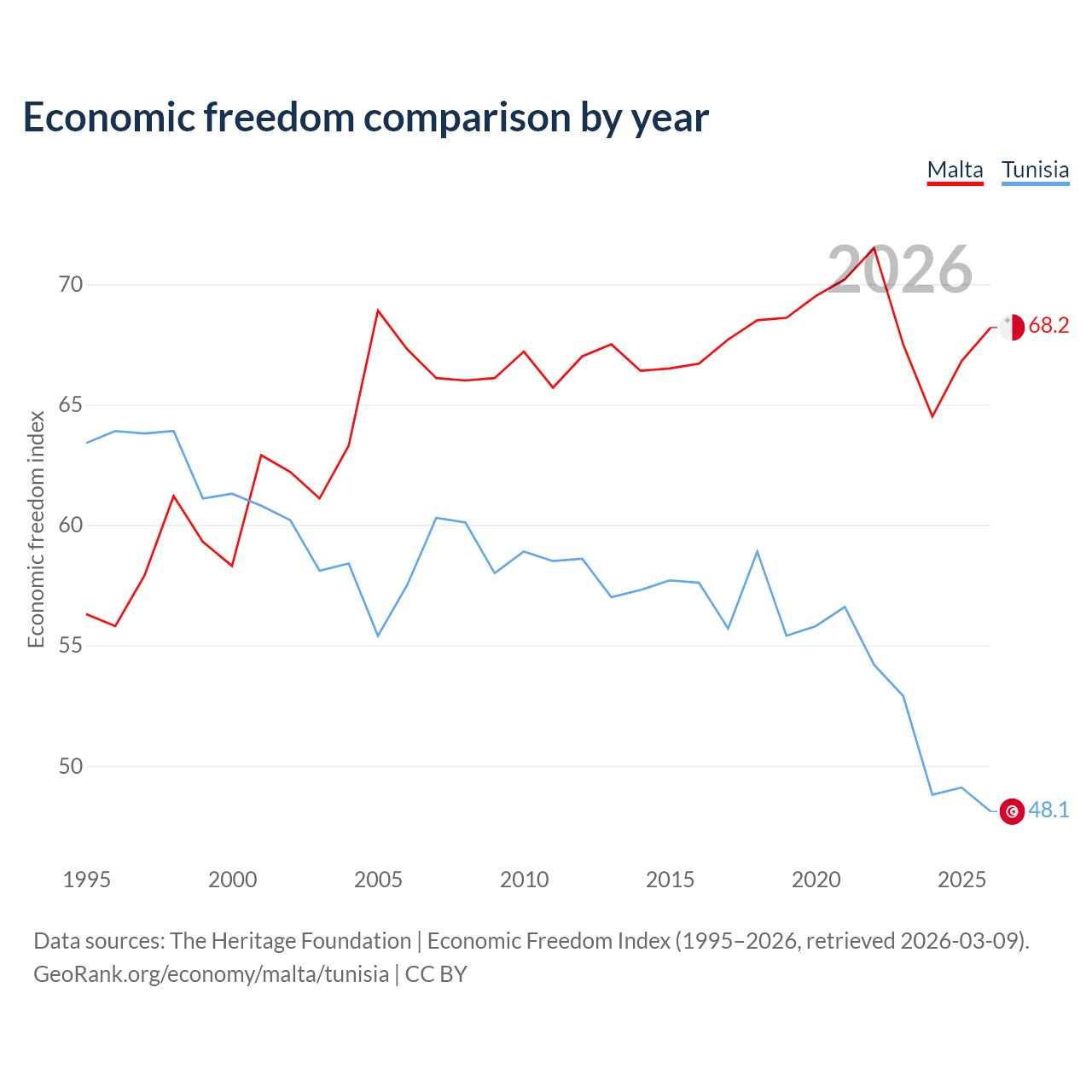 The Economic Freedom Index for Malta is 68.2, ranking 49/197, compared to 48.1 for Tunisia, ranking 172/197. The chart above displays a comparison of annual changes in economic freedom indexes.