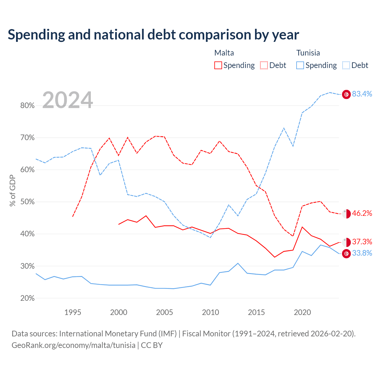 Malta has $11.5B in government debt (46.2% of GDP), compared to $42.8B (83.4% of GDP) in Tunisia.