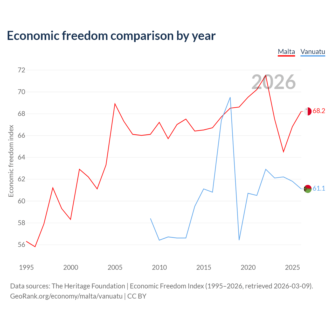 The Economic Freedom Index for Malta is 68.2, ranking 49/197, compared to 61.1 for Vanuatu, ranking 92/197. The chart above displays a comparison of annual changes in economic freedom indexes.