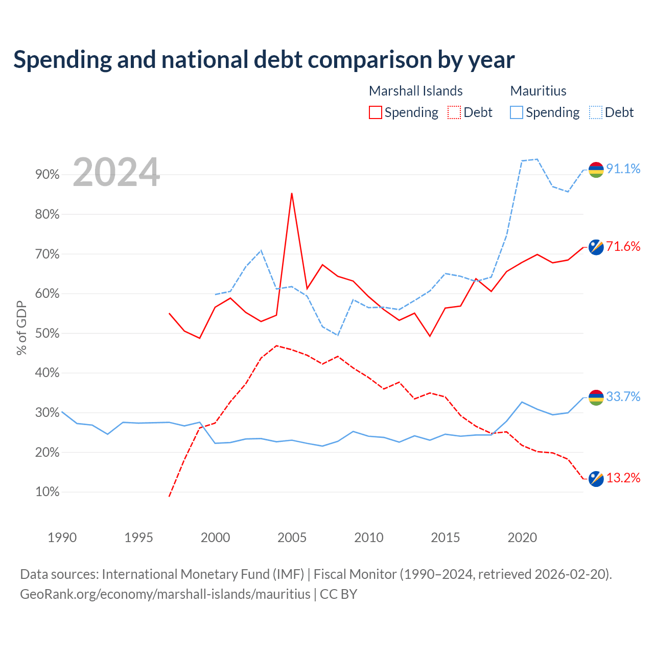 The Marshall Islands has $38.4M in government debt (13.2% of GDP), compared to $13.6B (91.1% of GDP) in Mauritius.