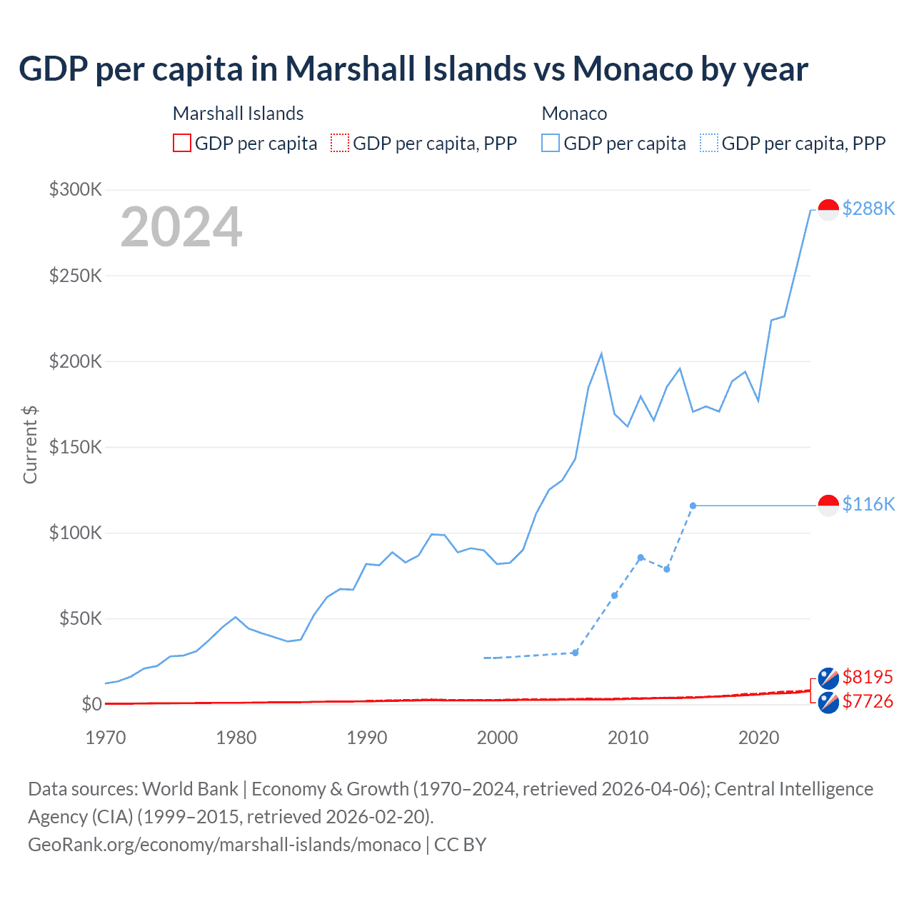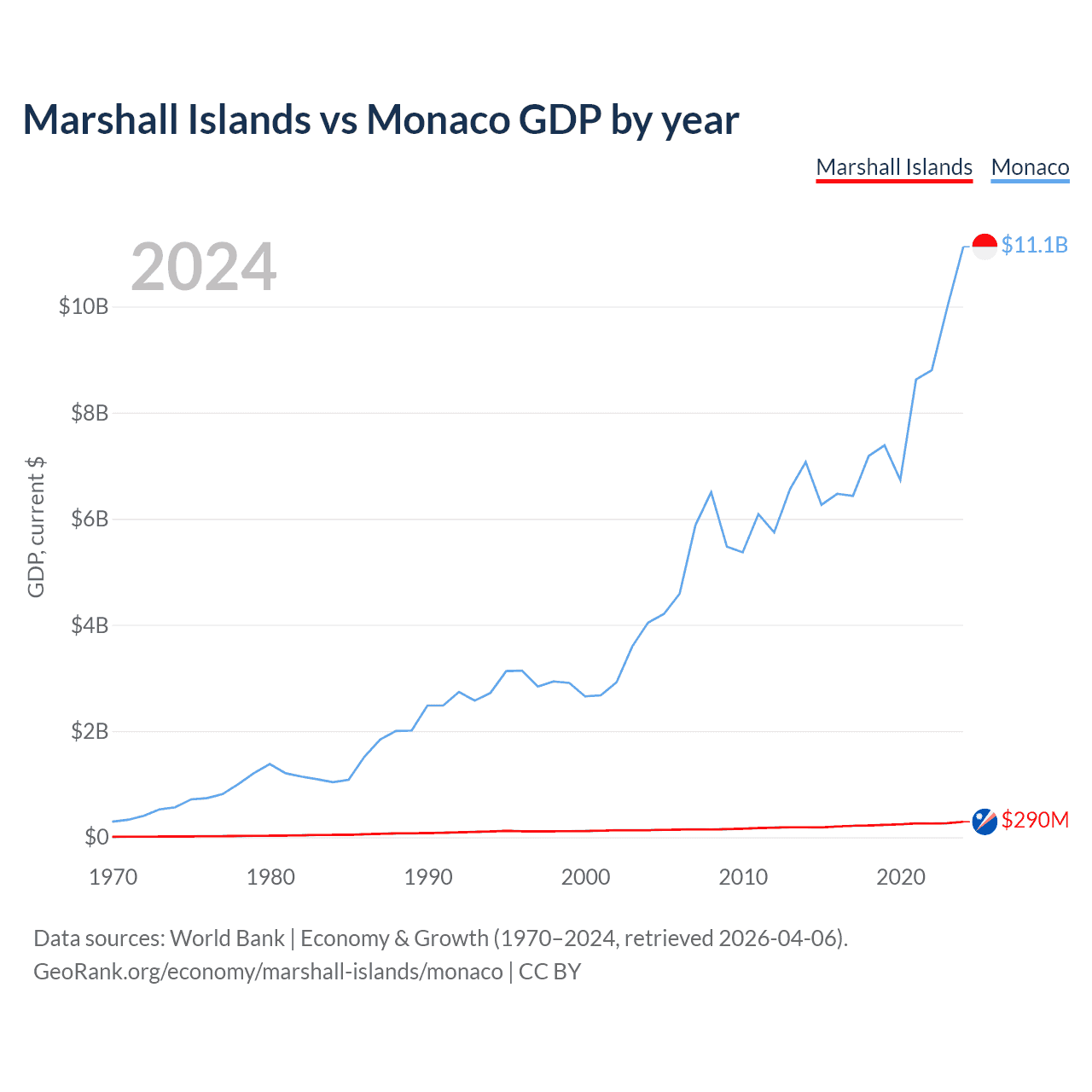 The Marshall Islands has a GDP of $290M compared to $11.1B for Monaco, ranking 193/197 and 152/197 by economy size, respectively.