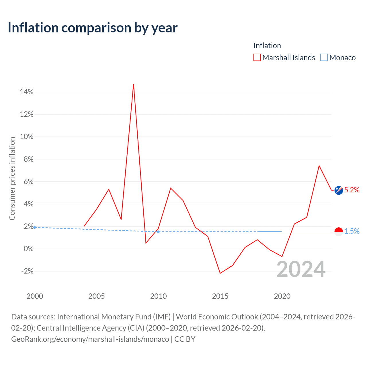 Over the past 17 years, the Marshall Islands has recorded an average annual inflation rate of 2.32%, compared with 1.5% in Monaco. In 2020, inflation was 5.2% in the Marshall Islands and 1.5% in Monaco.