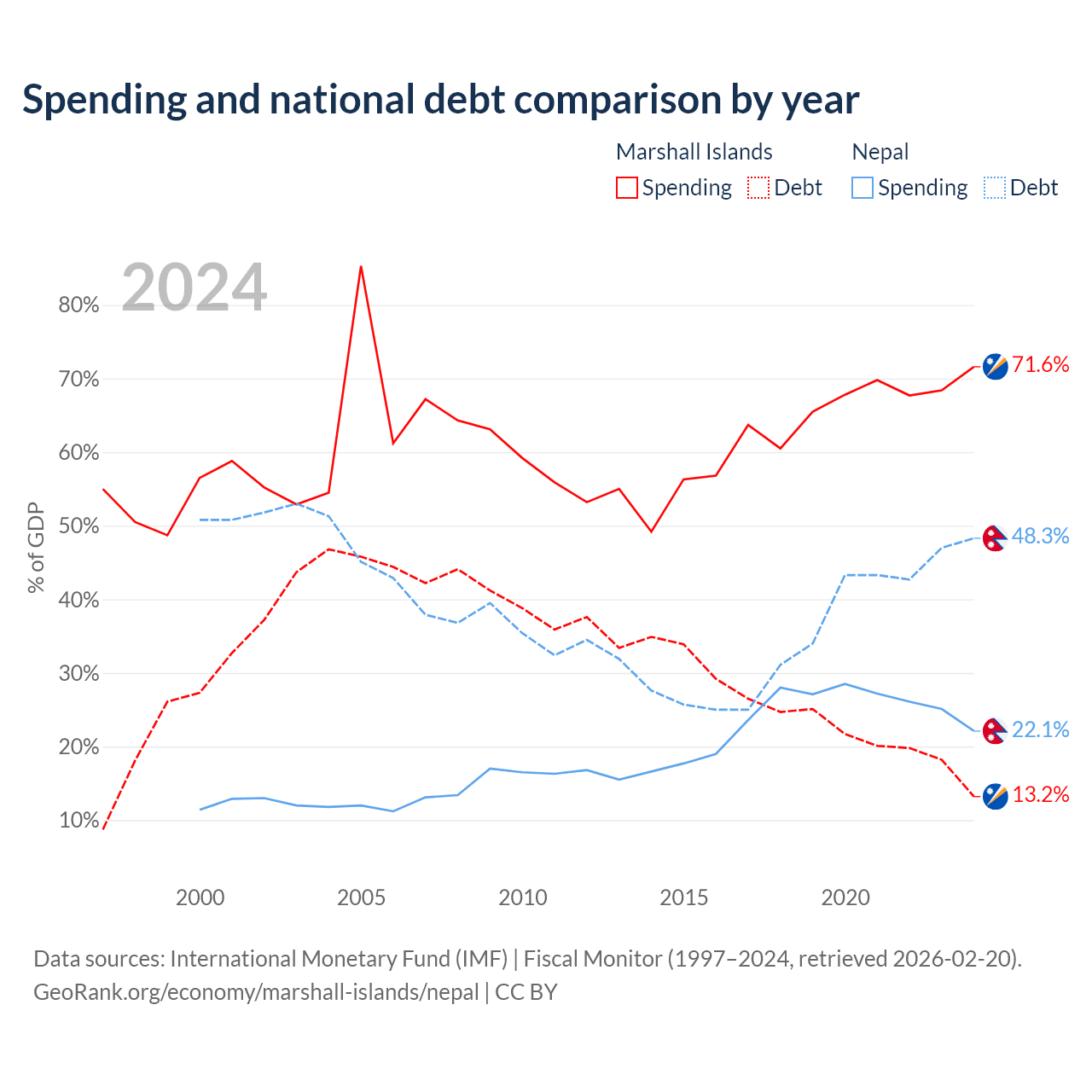 The Marshall Islands has $38.4M in government debt (13.2% of GDP), compared to $20.7B (48.3% of GDP) in Nepal.