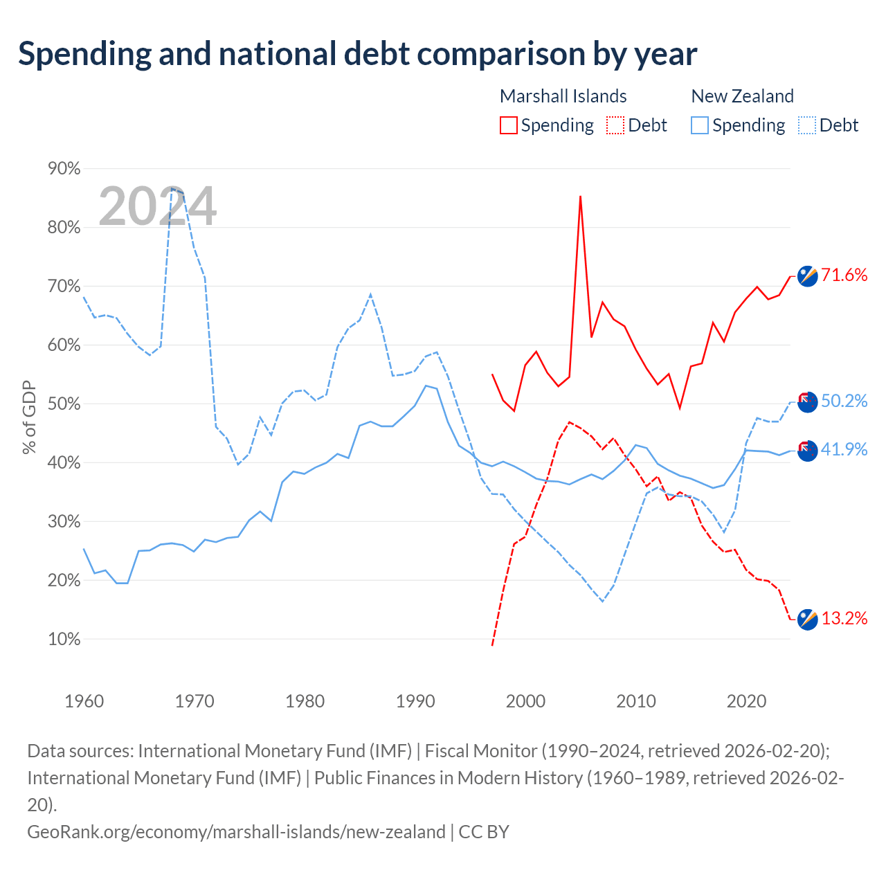 The Marshall Islands has $38.4M in government debt (13.2% of GDP), compared to $131B (50.2% of GDP) in New Zealand.