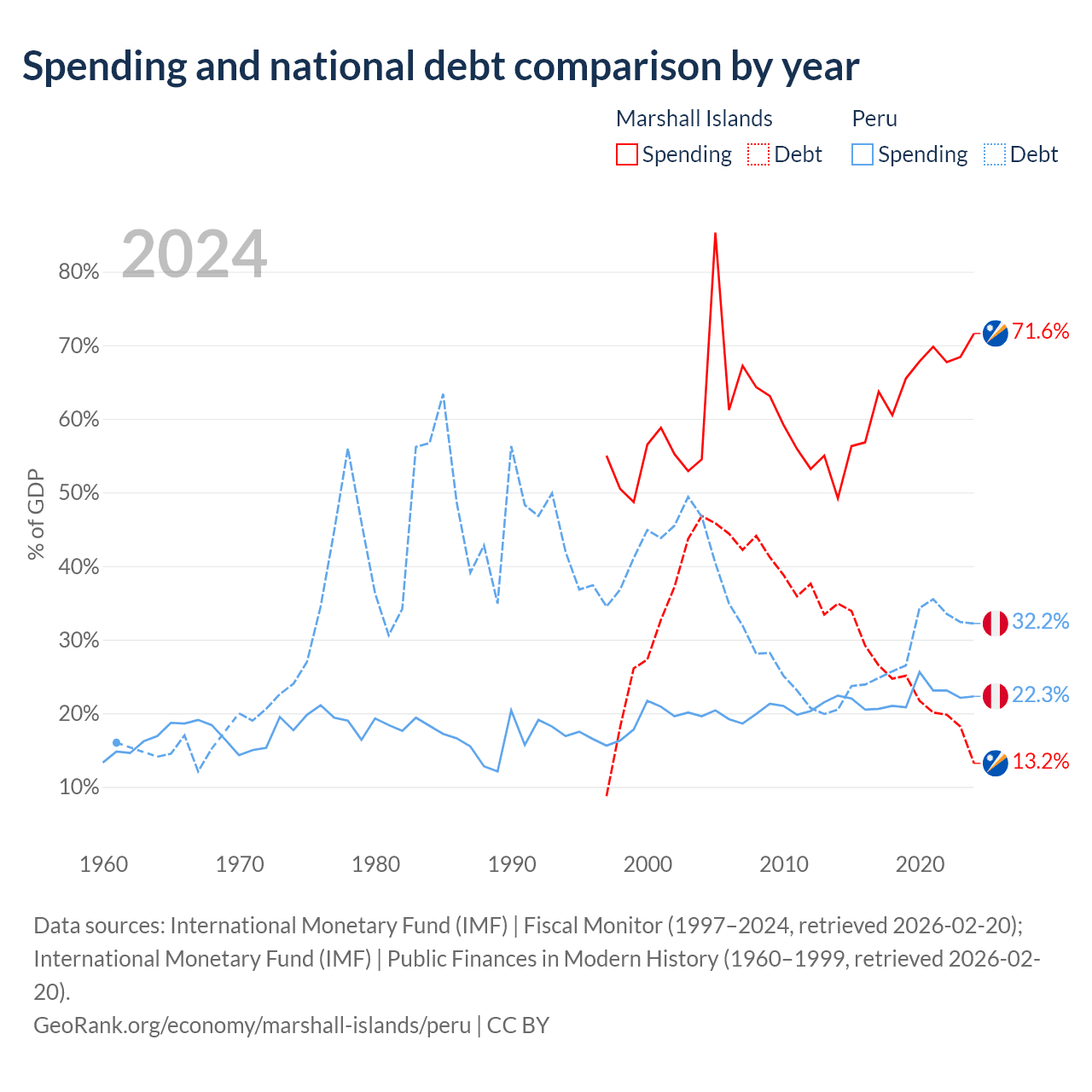 The Marshall Islands has $38.4M in government debt (13.2% of GDP), compared to $93B (32.2% of GDP) in Peru.
