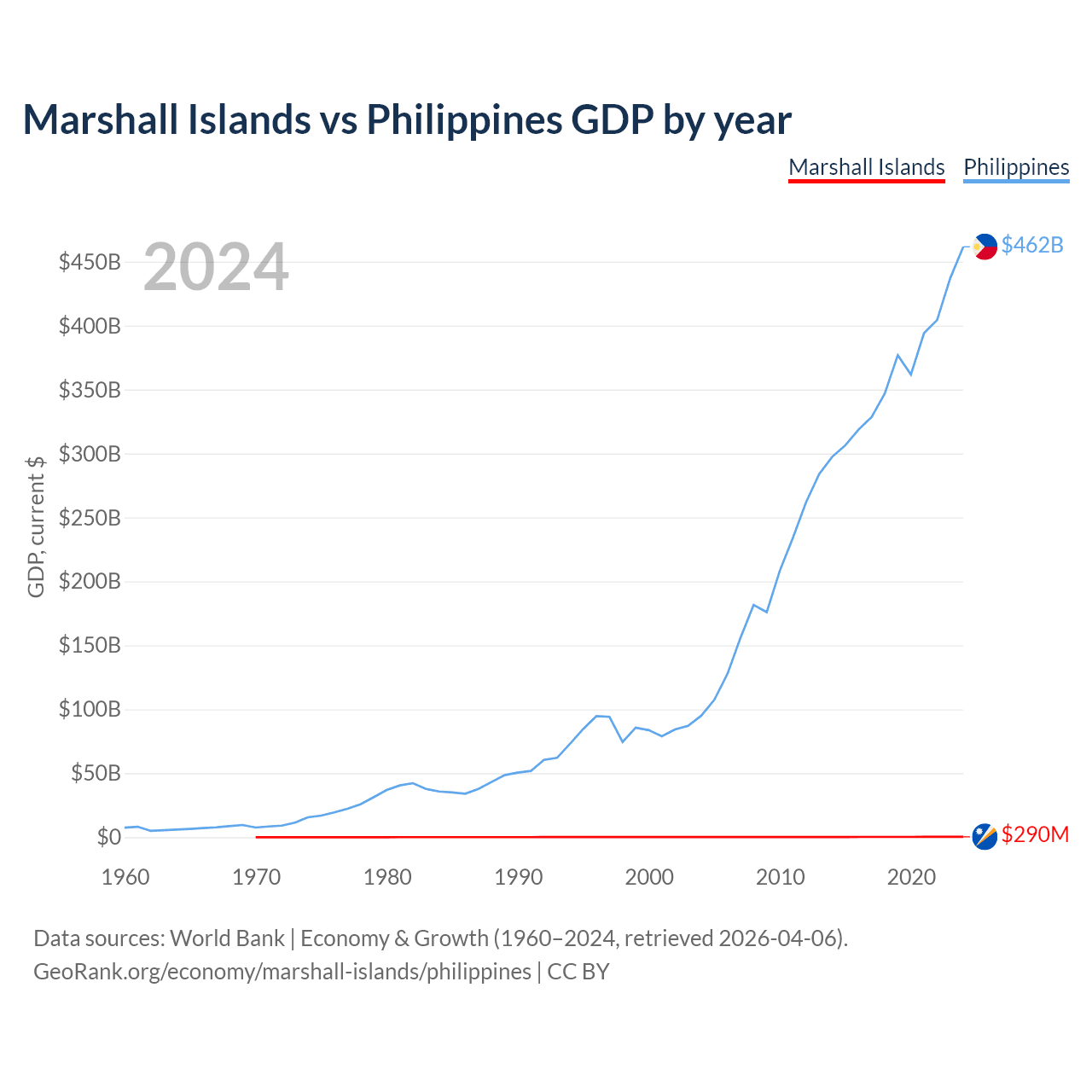 The Marshall Islands has a GDP of $290M compared to $462B for the Philippines, ranking 193/197 and 35/197 by economy size, respectively.