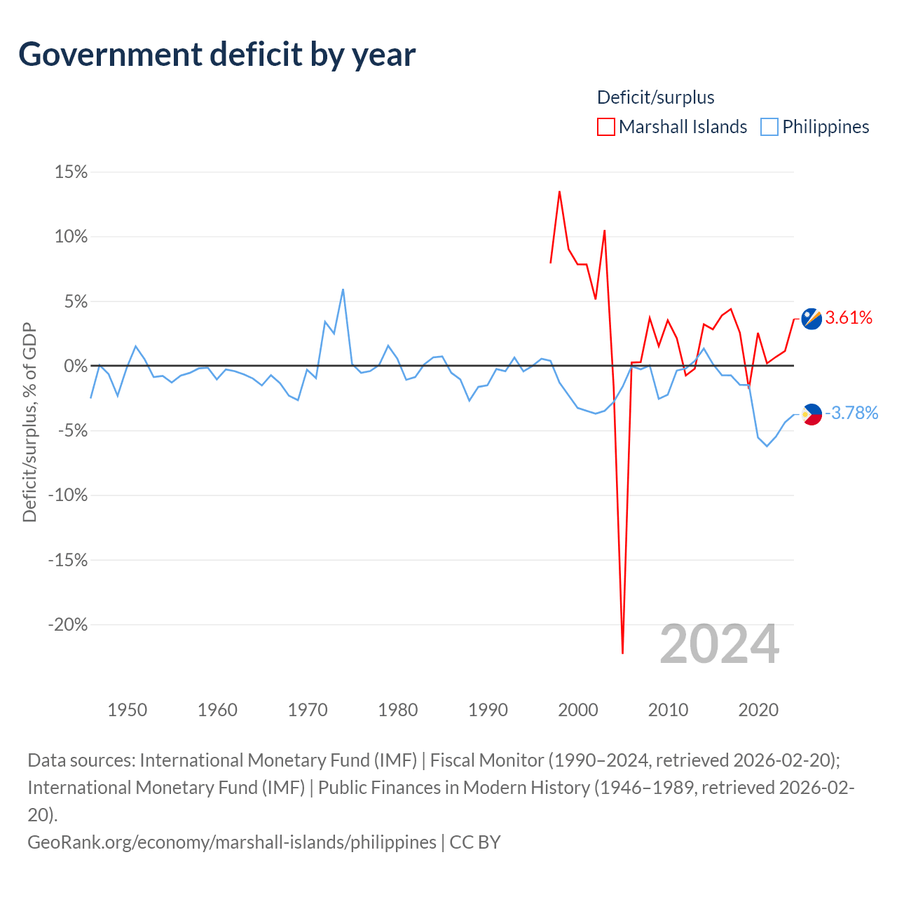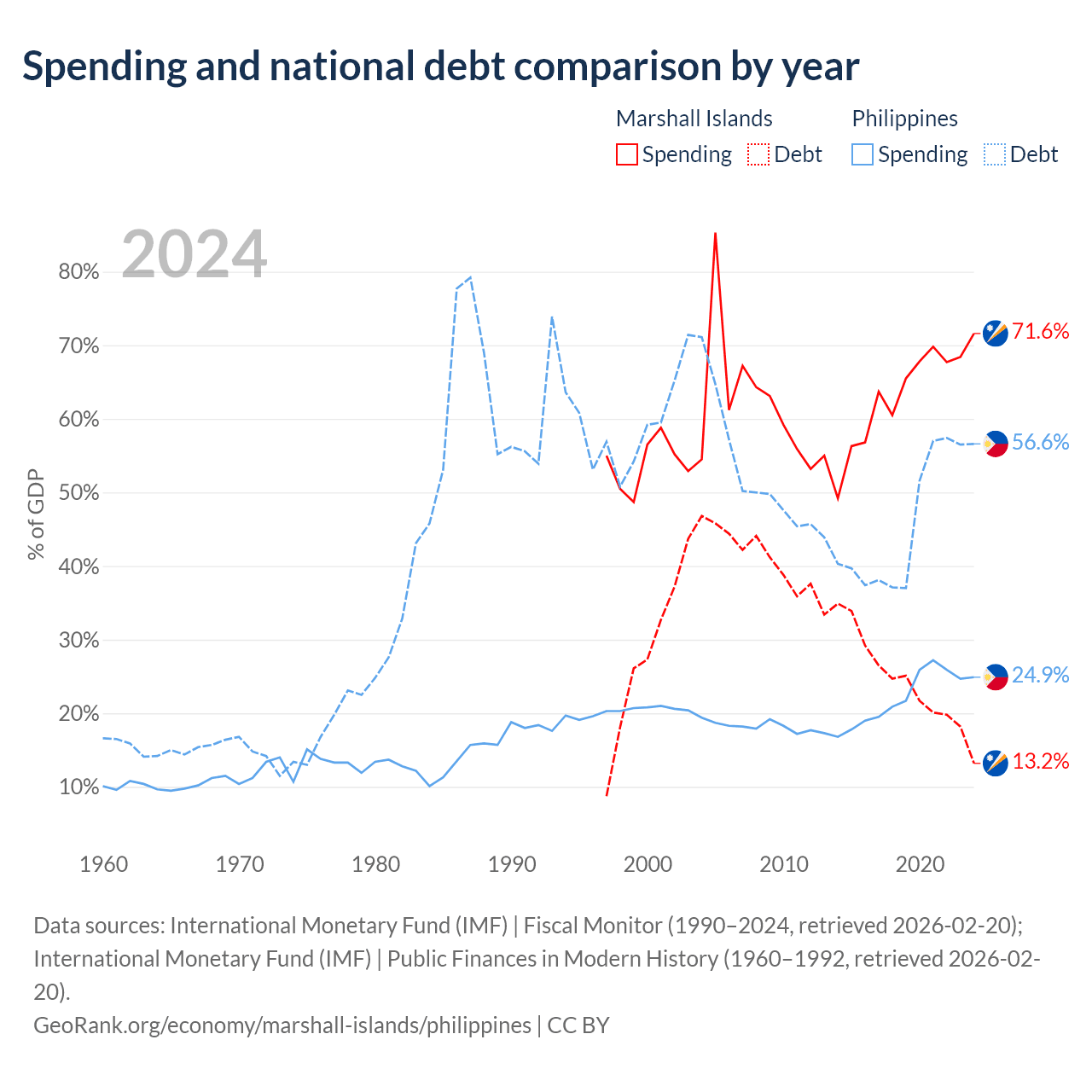 The Marshall Islands has $38.4M in government debt (13.2% of GDP), compared to $261B (56.6% of GDP) in the Philippines.