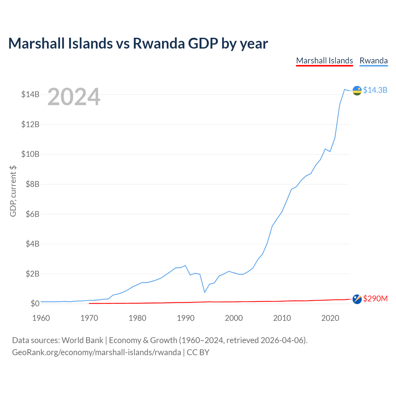 The Marshall Islands has a GDP of $290M compared to $14.3B for Rwanda, ranking 193/197 and 144/197 by economy size, respectively.