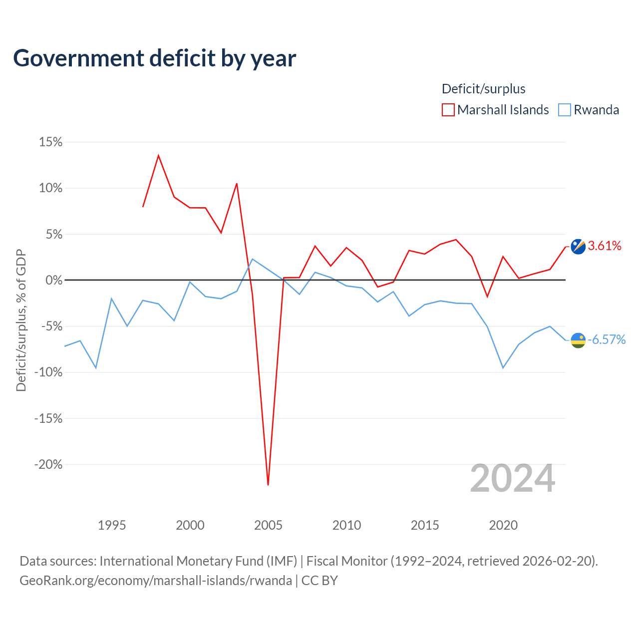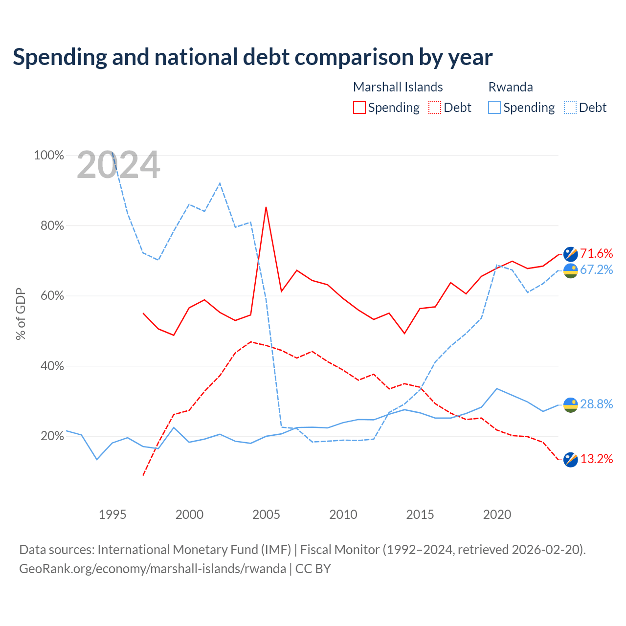 The Marshall Islands has $38.4M in government debt (13.2% of GDP), compared to $9.58B (67.2% of GDP) in Rwanda.