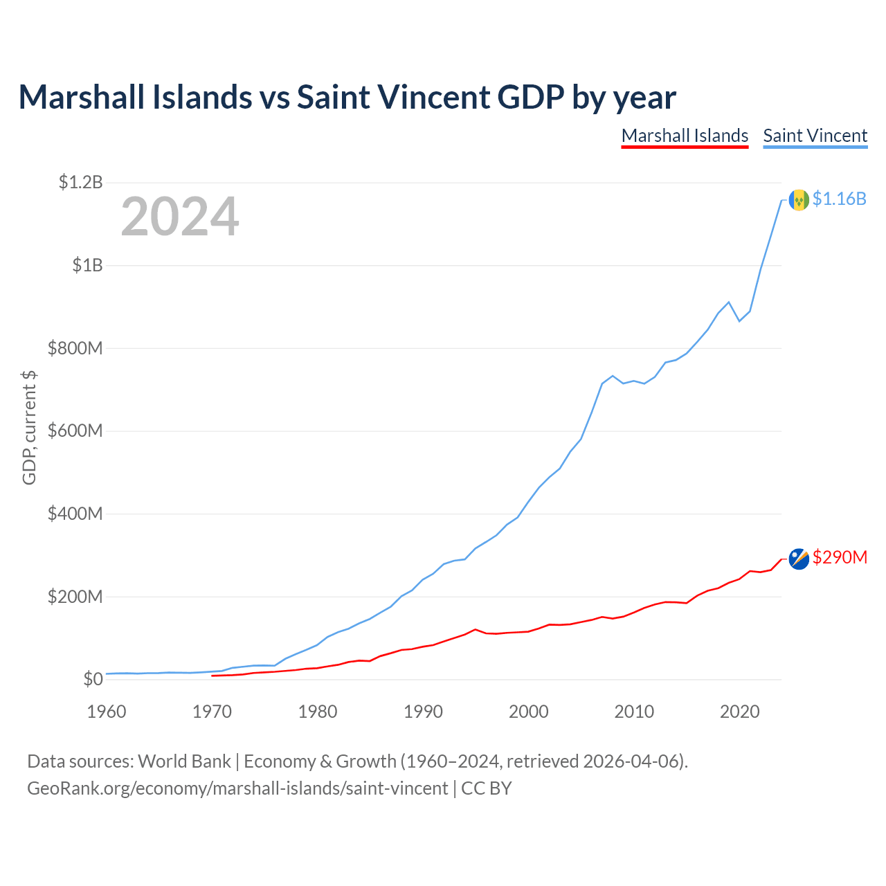 The Marshall Islands has a GDP of $290M compared to $1.16B for Saint Vincent, ranking 193/197 and 186/197 by economy size, respectively.
