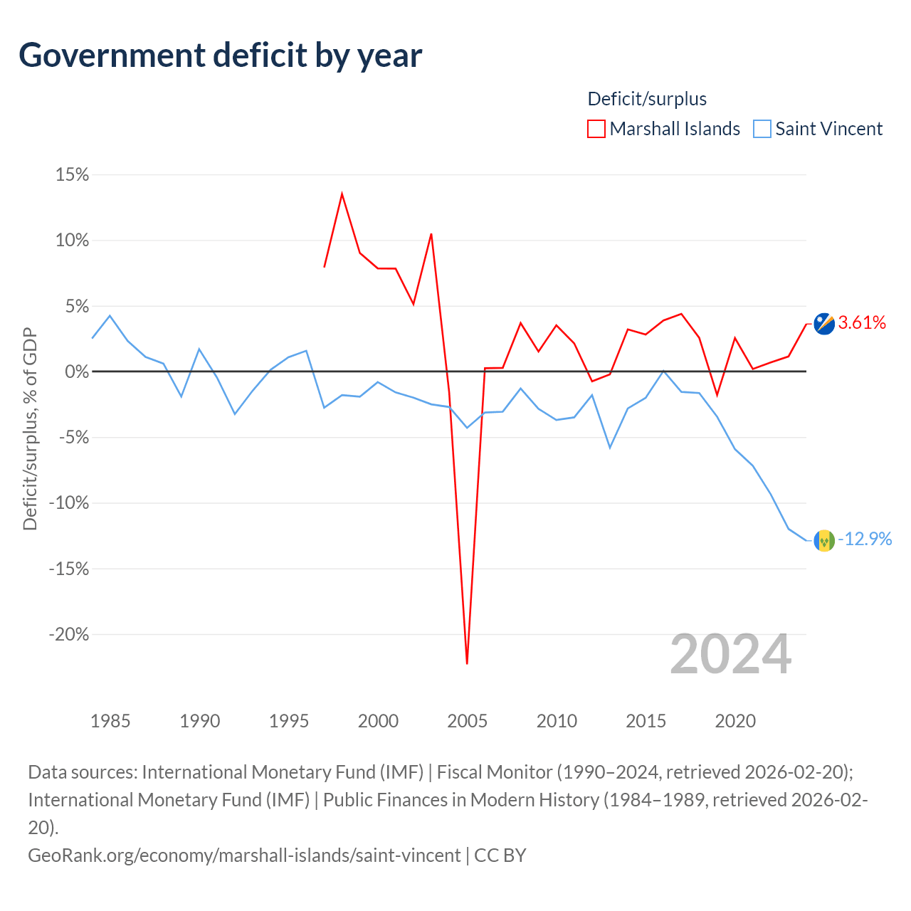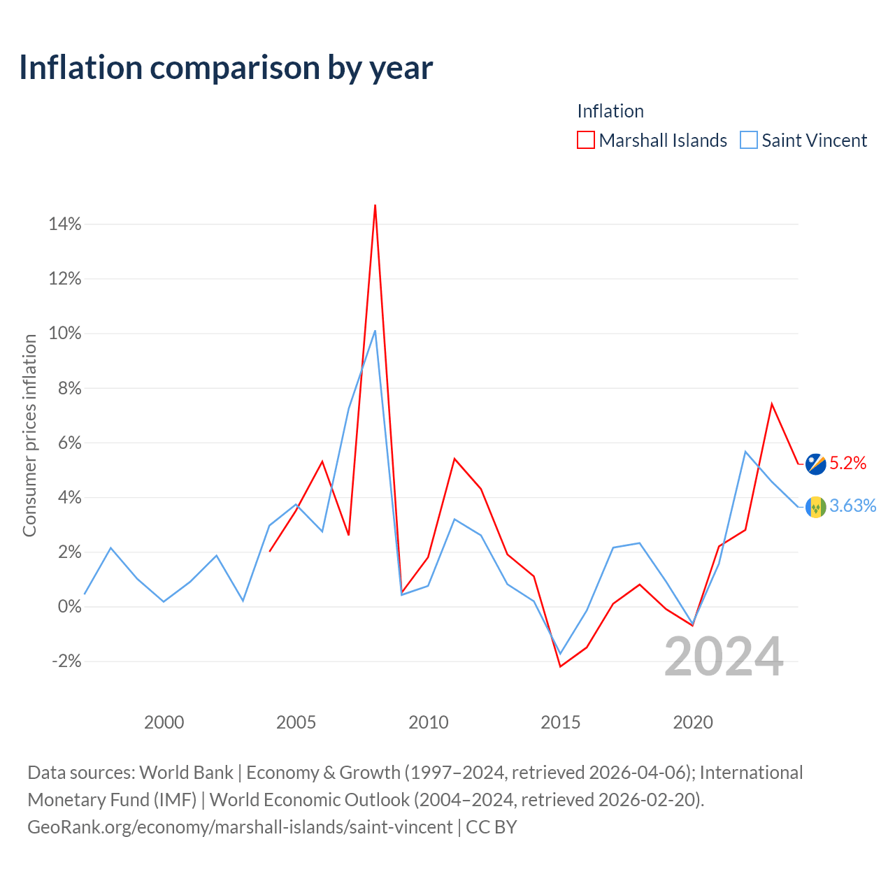 Over the past 21 years, the Marshall Islands has recorded an average annual inflation rate of 2.72%, compared with 2.52% in Saint Vincent. In 2024, inflation was 5.2% in the Marshall Islands and 3.63% in Saint Vincent.