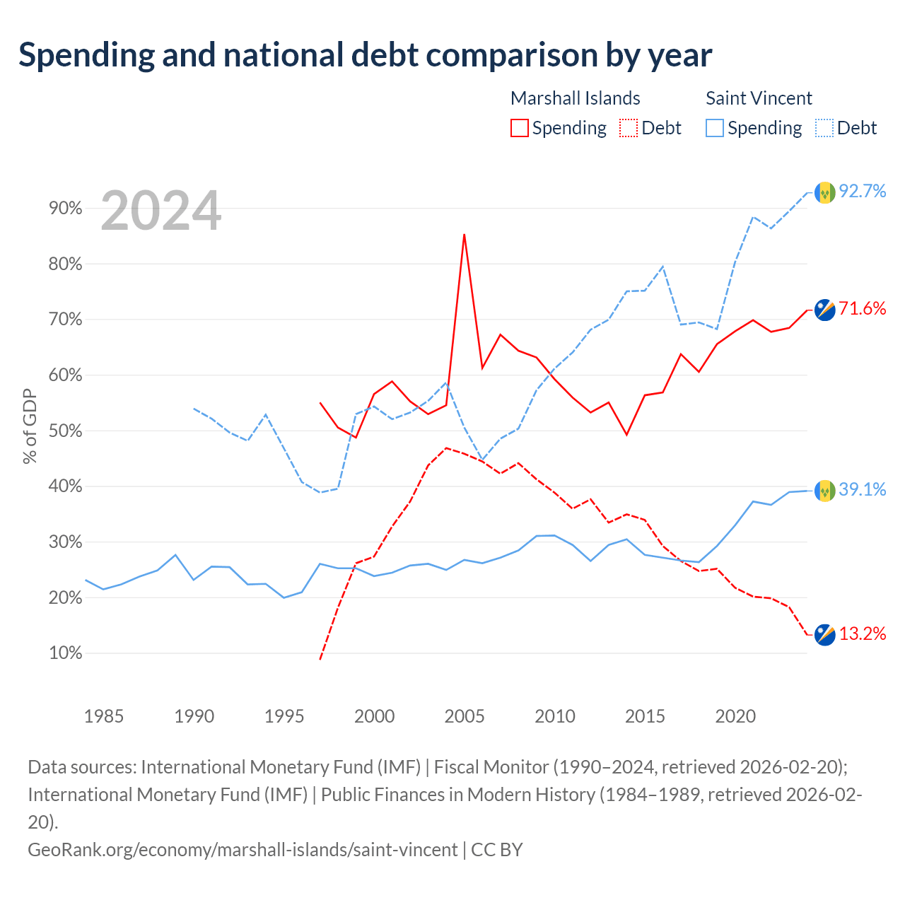 The Marshall Islands has $38.4M in government debt (13.2% of GDP), compared to $1.07B (92.7% of GDP) in Saint Vincent.
