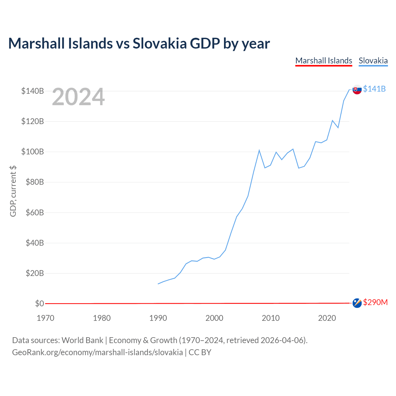 The Marshall Islands has a GDP of $290M compared to $141B for Slovakia, ranking 193/197 and 61/197 by economy size, respectively.