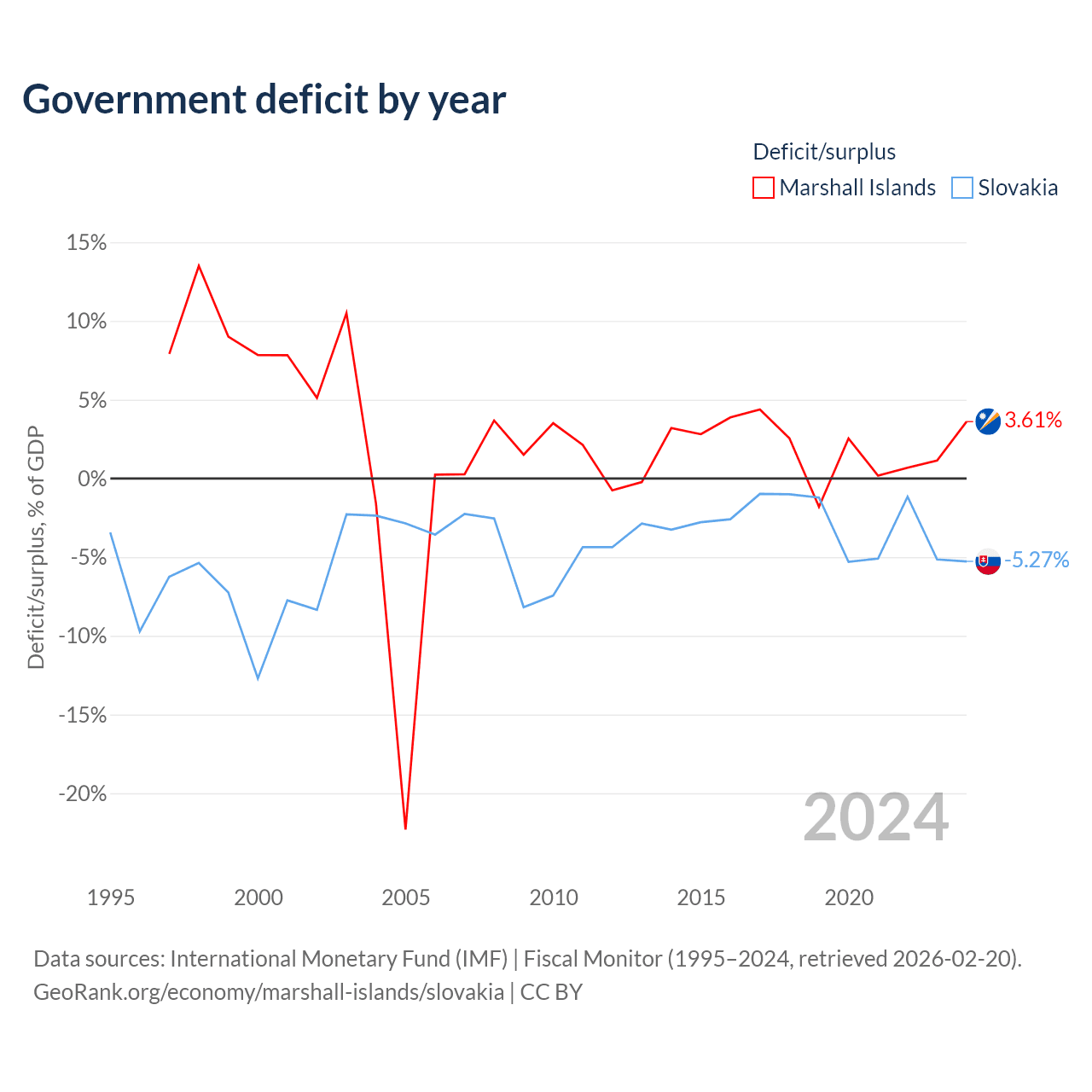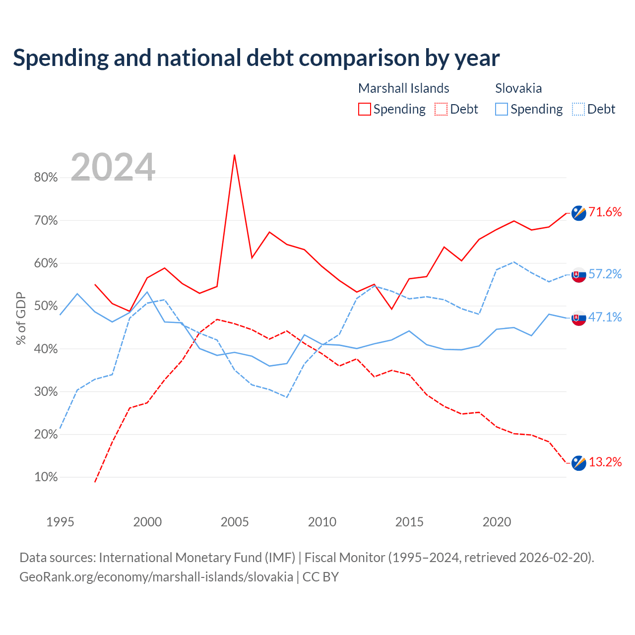 The Marshall Islands has $38.4M in government debt (13.2% of GDP), compared to $80.7B (57.2% of GDP) in Slovakia.