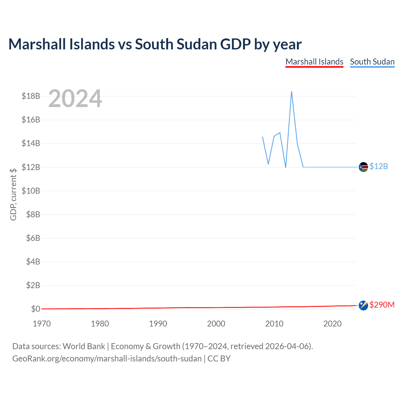 The Marshall Islands has a GDP of $290M compared to $12B for South Sudan, ranking 193/197 and 149/197 by economy size, respectively.